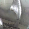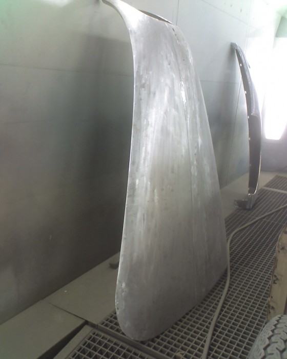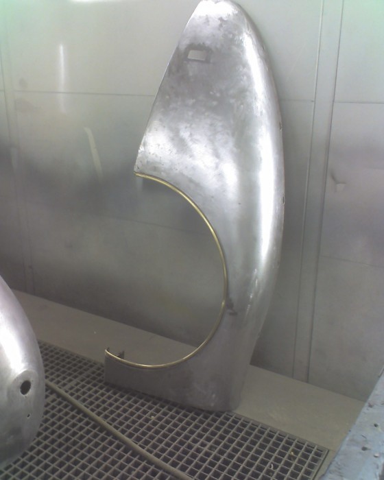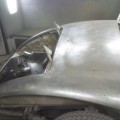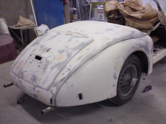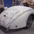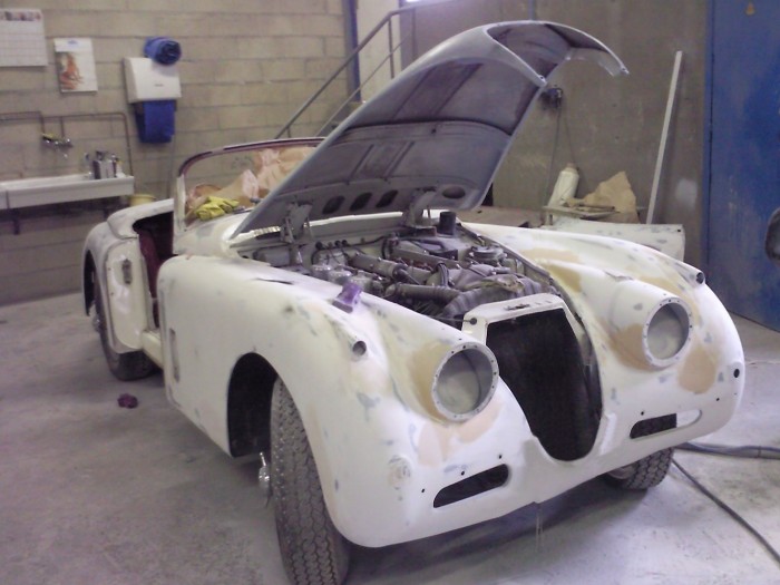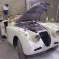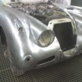 Mise à nue de la carrosserie pour une nouvelle peinture sur cette Jaguar XK 150 S.