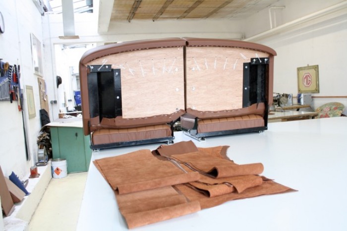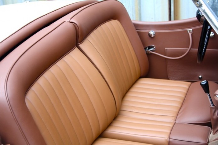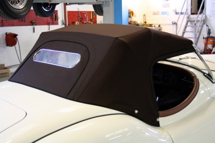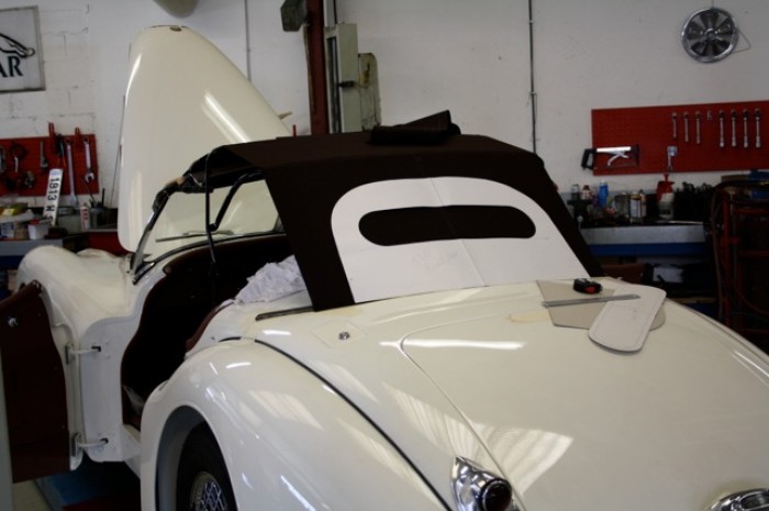 Capote en alpaga et sellerie cuir taillée sur mesure dans nos ateliers pour cette Jaguar.