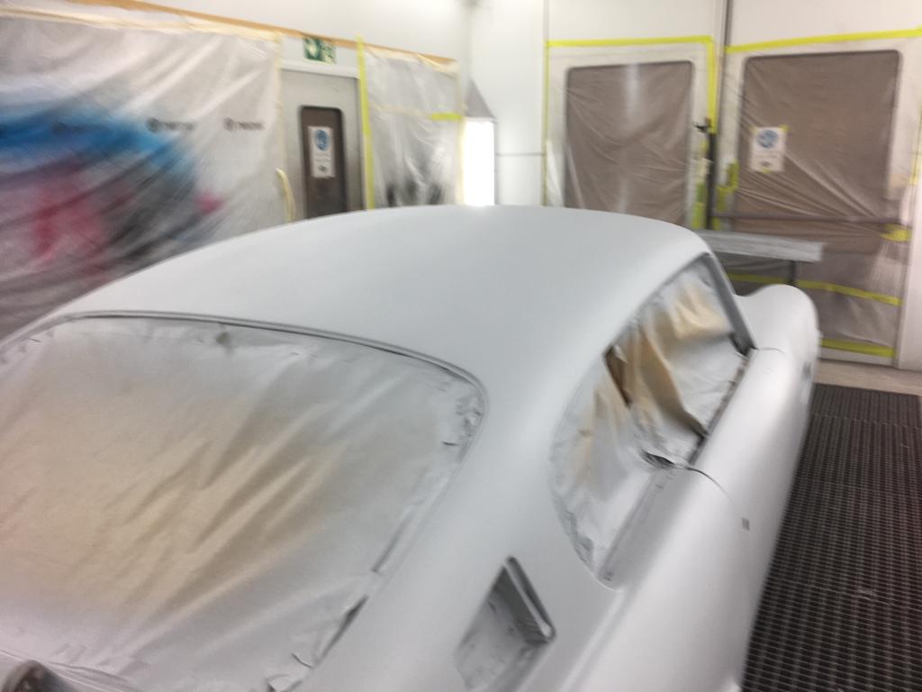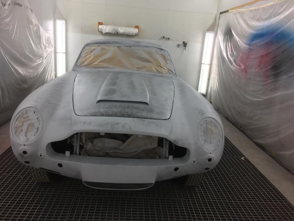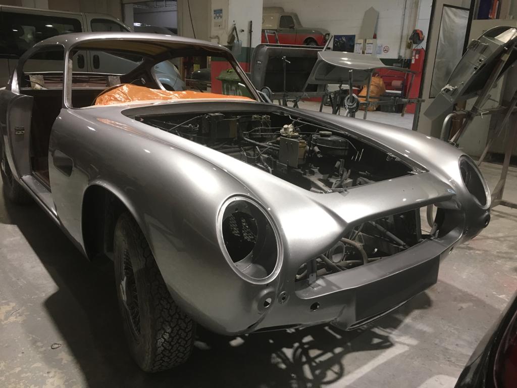 Mise à nue de la carrosserie pour une préparation peinture de cette Aston Martin DB6 MKII