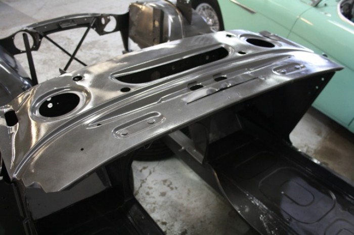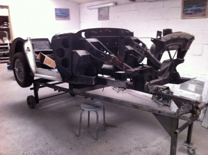 Austin Healey 3000 en restauration complète (mécanique, carrosserie, sellerie) dans nos ateliers.