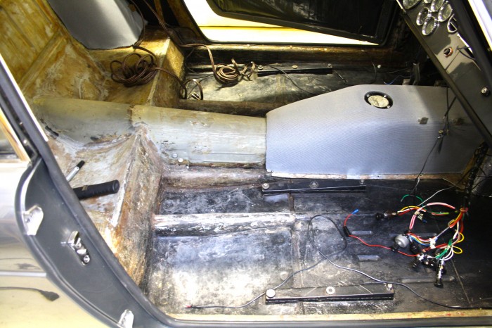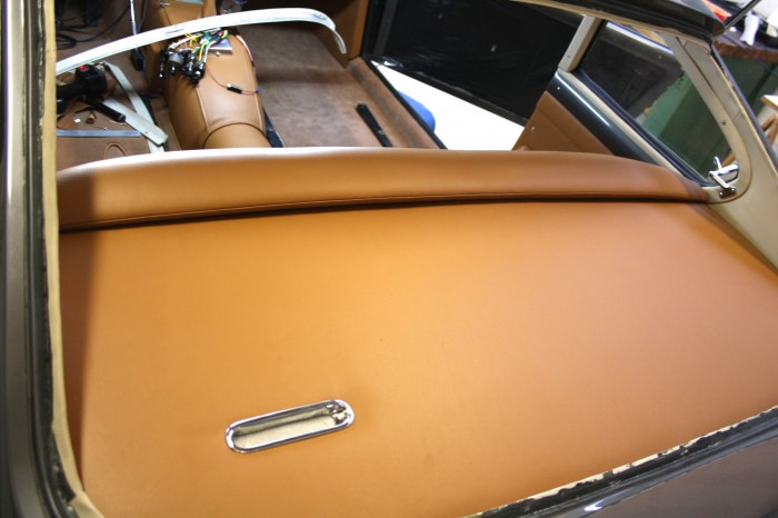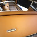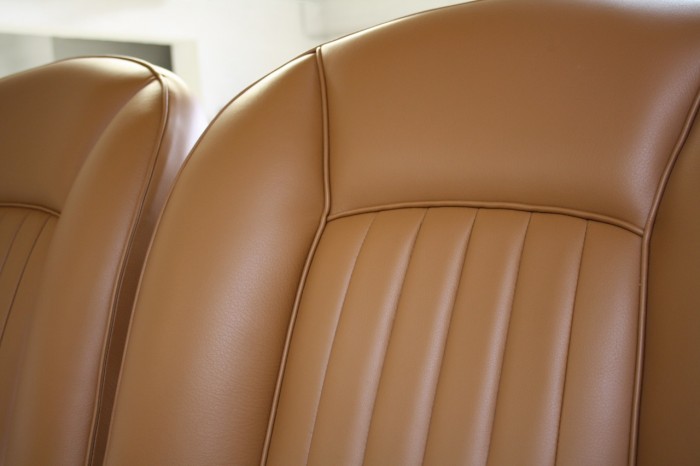 Panneaux de portes, sièges, console centrale en cuir pleine fleur, confection d'un jeu de moquette sur mesure et isolation complète de l'intérieur contre la chaleur, ciel de toit.