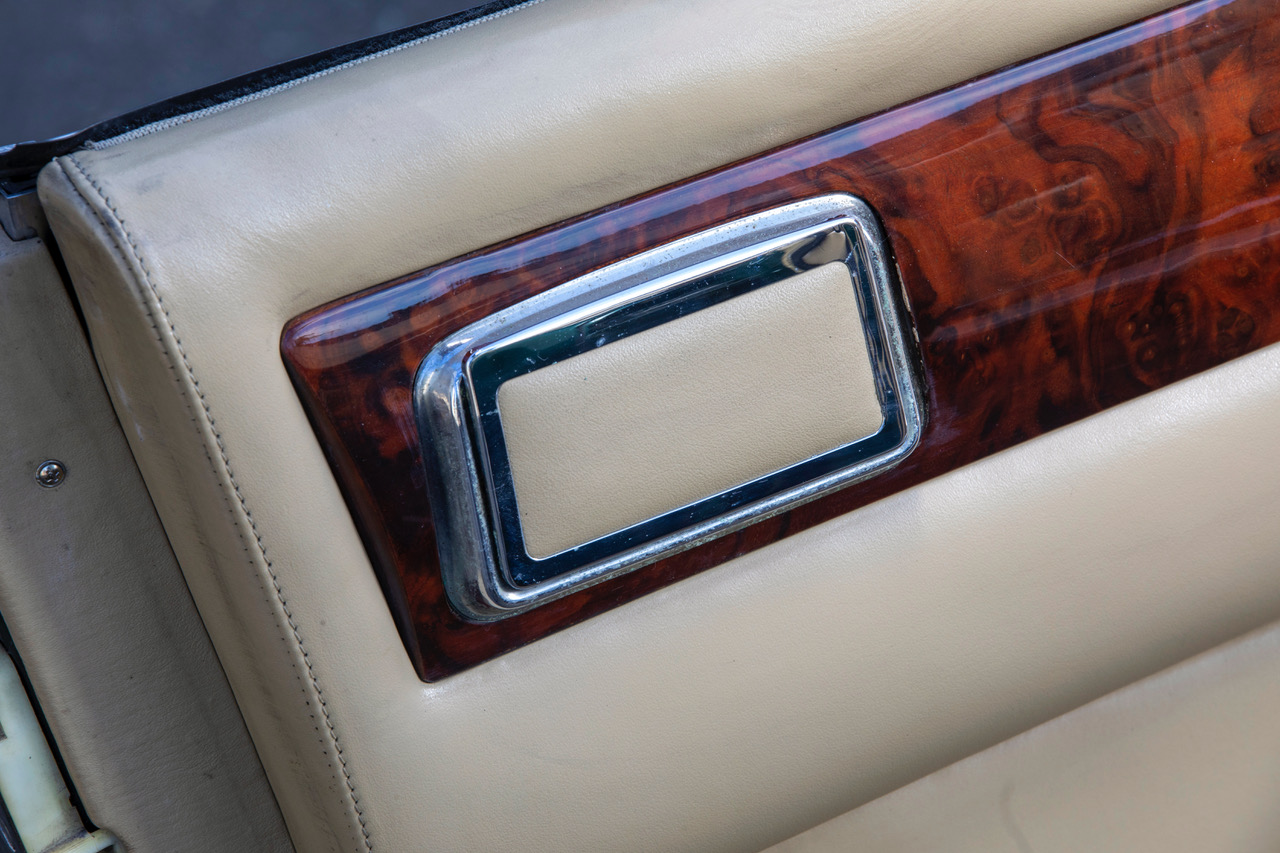 Elle possède encore sa sellerie d'origine en cuir beige en très bel état, les sièges et les cartons de porte ont une très belle patine. Les moquettes et la capote sont également très bien conservées.
