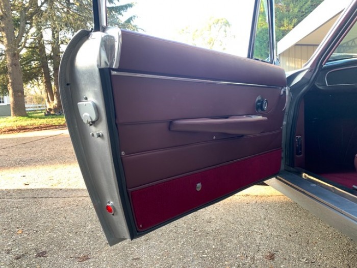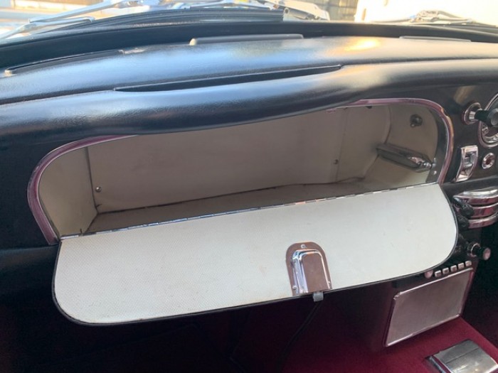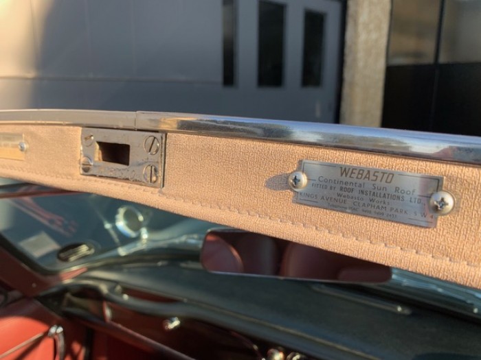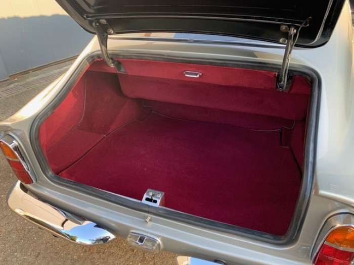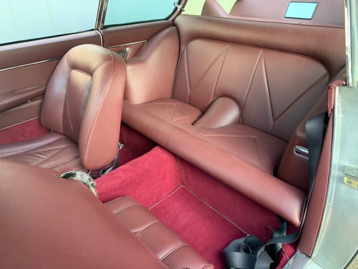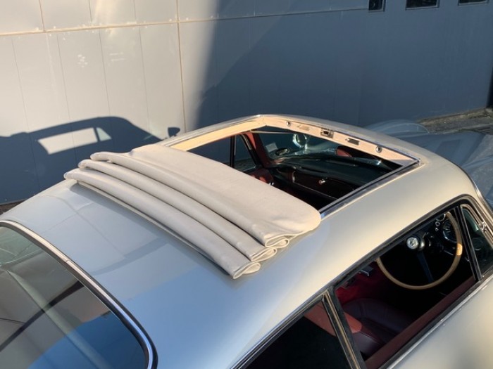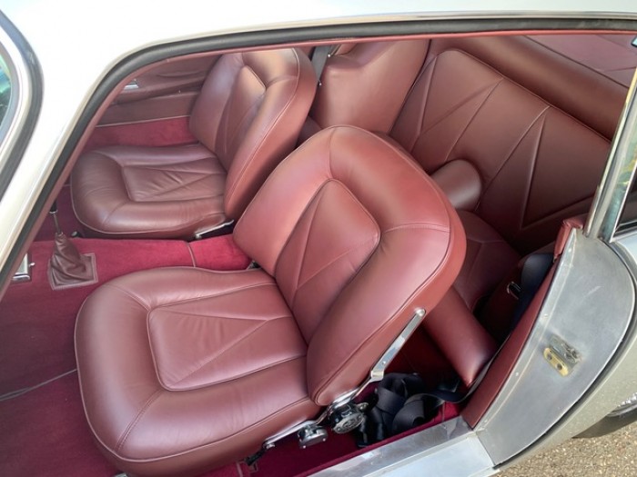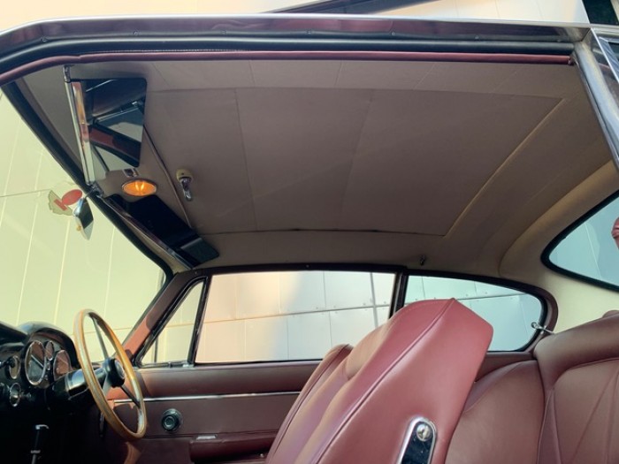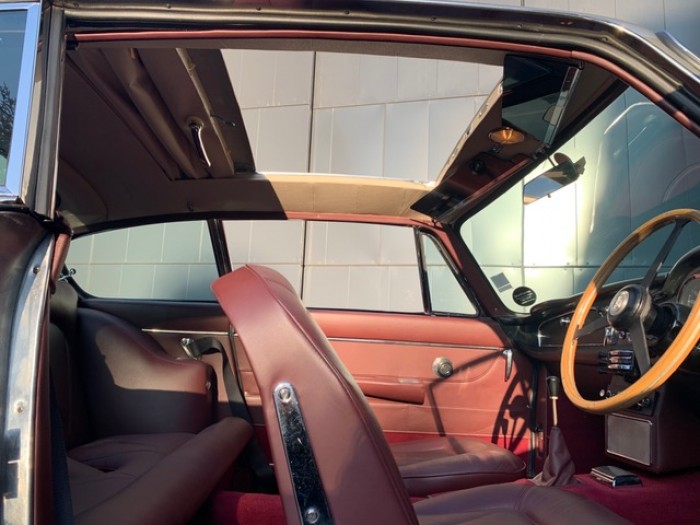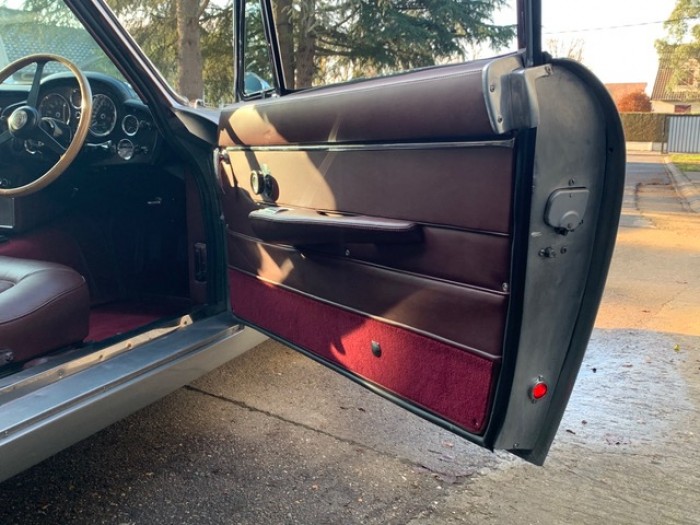 Sa sellerie en cuir bordeaux fut refaite en 2016 dans nos ateliers incluant les moquettes et est toujours en parfait état. Le pavillon est propre ainsi que le webasto.
