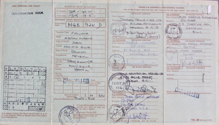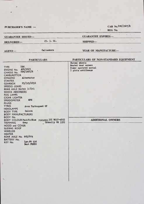 Vendue neuve en Angleterre en Avril 1966, nous avons la carte grise anglaise d'origine ainsi que tout son dossier de factures. Elle quitta la Grande-Bretagne fin 80 pour arriver aux Pays-Bas, puis en 2015 elle changea de main à destination de la France. Le dernier propriétaire nous a commandé la restauration de sa sellerie et de la mécanique.