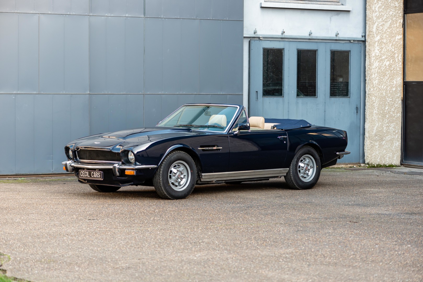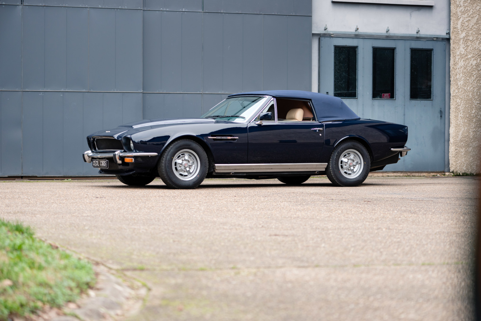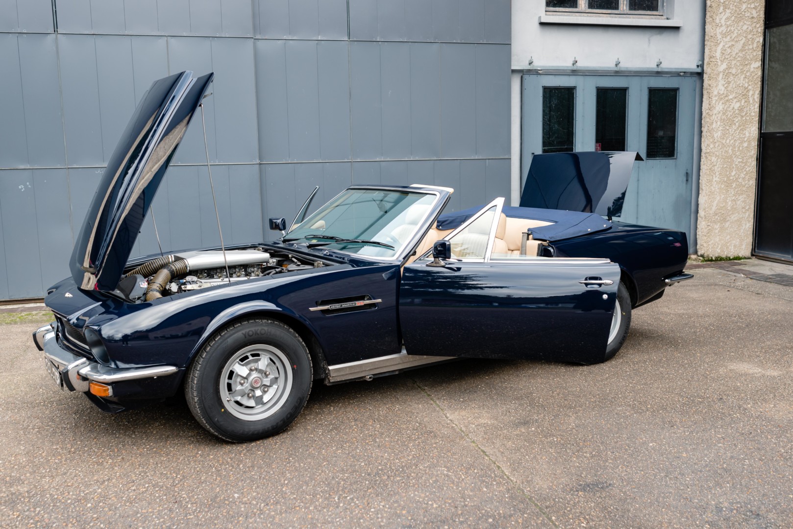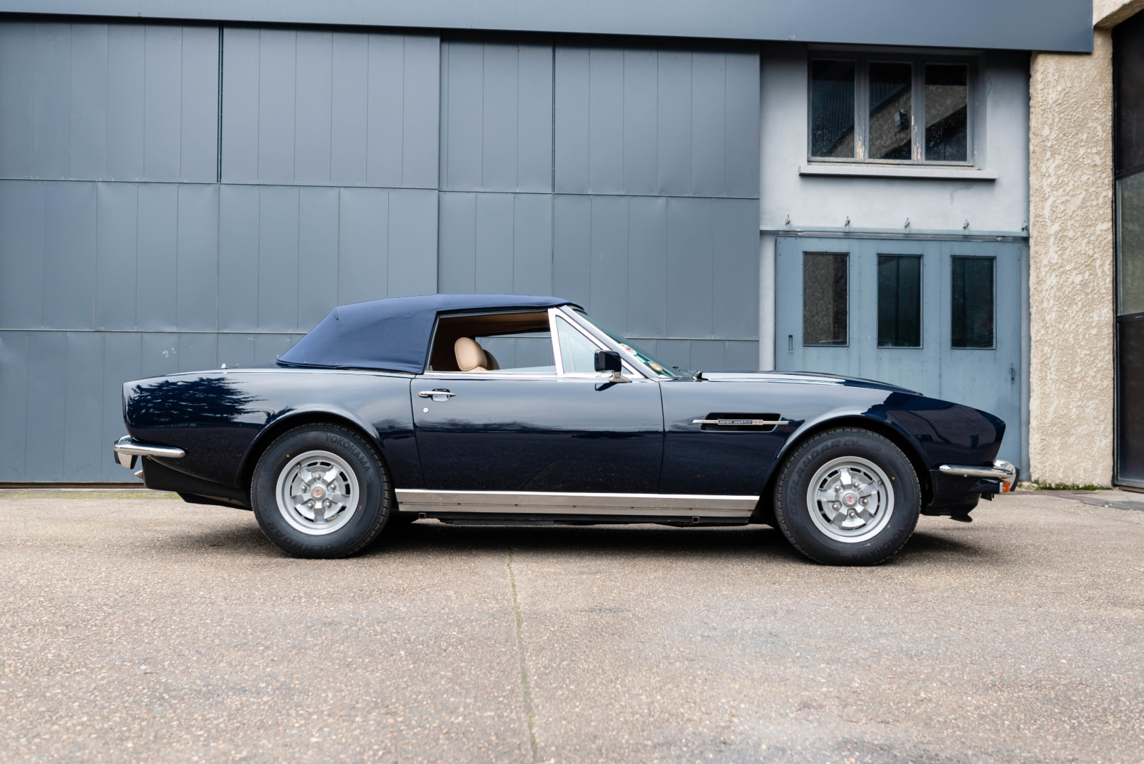 La V8 Volante reprend la ligne tendue et musclée de la V8 Coupé, signée William Towns, tout en y ajoutant une capote en toile parfaitement intégrée. Le dessin reste sobre, équilibré et intemporel, avec une présence sur route immédiatement reconnaissable.