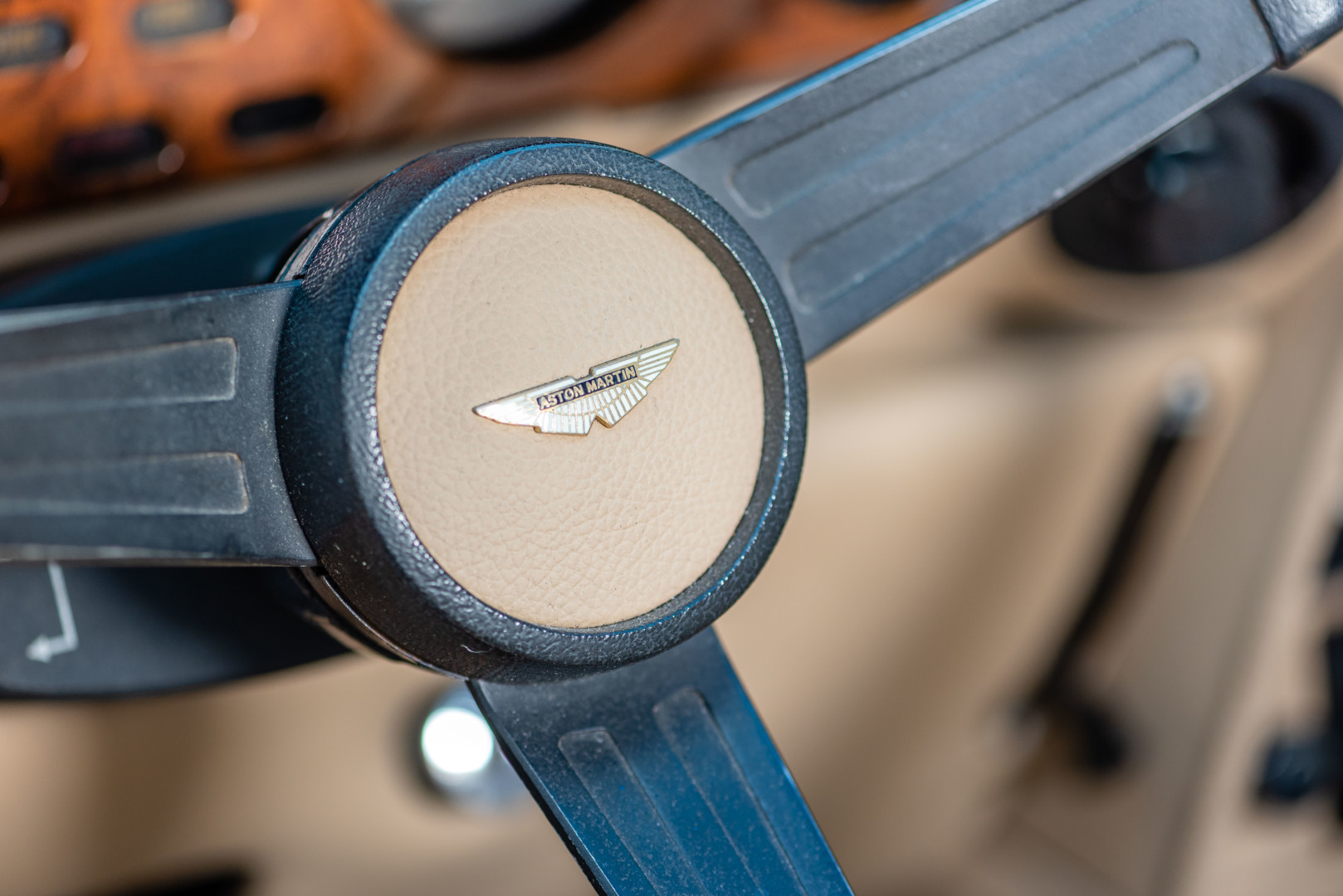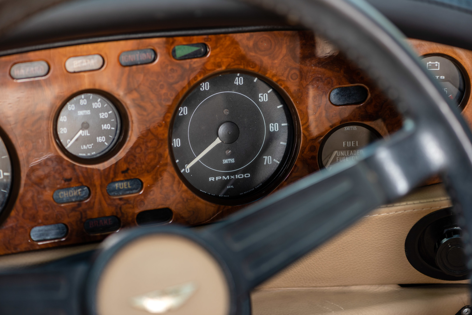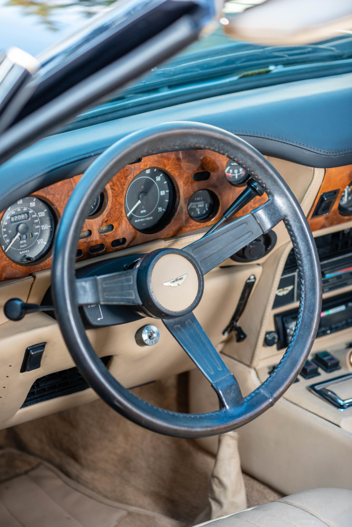 Comme toutes les Aston Martin produites à Newport Pagnell, la V8 Volante bénéficie d’une fabrication largement artisanale. L’habitacle est habillé de cuir Connolly, de boiseries en ronce de noyer et d’instruments Smiths, créant une atmosphère chaleureuse et luxueuse.