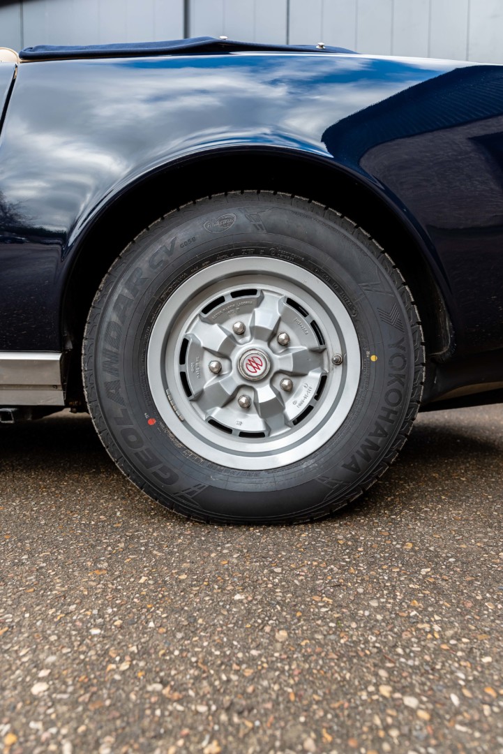 La voiture a été repeinte en bleu marine il y a quelques années. La carrosserie est saine et présente très bien. Elle montre naturellement quelques traces du temps, sans aucun travail à prévoir à ce jour.