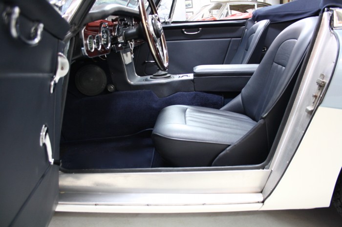 Voiture que nous entretenons depuis sa restauration, sellerie en cuir bleu marine confectionnée sur mesure est en excellent état. La carrosserie fut mise à nu. Capotage bleu marine en alpaga.