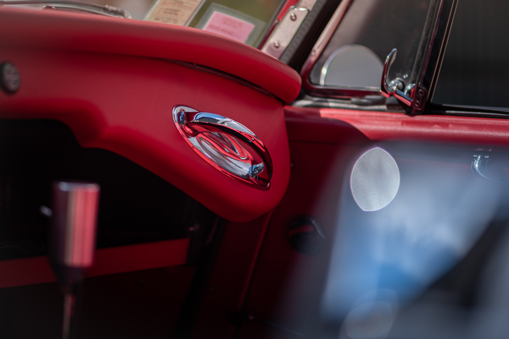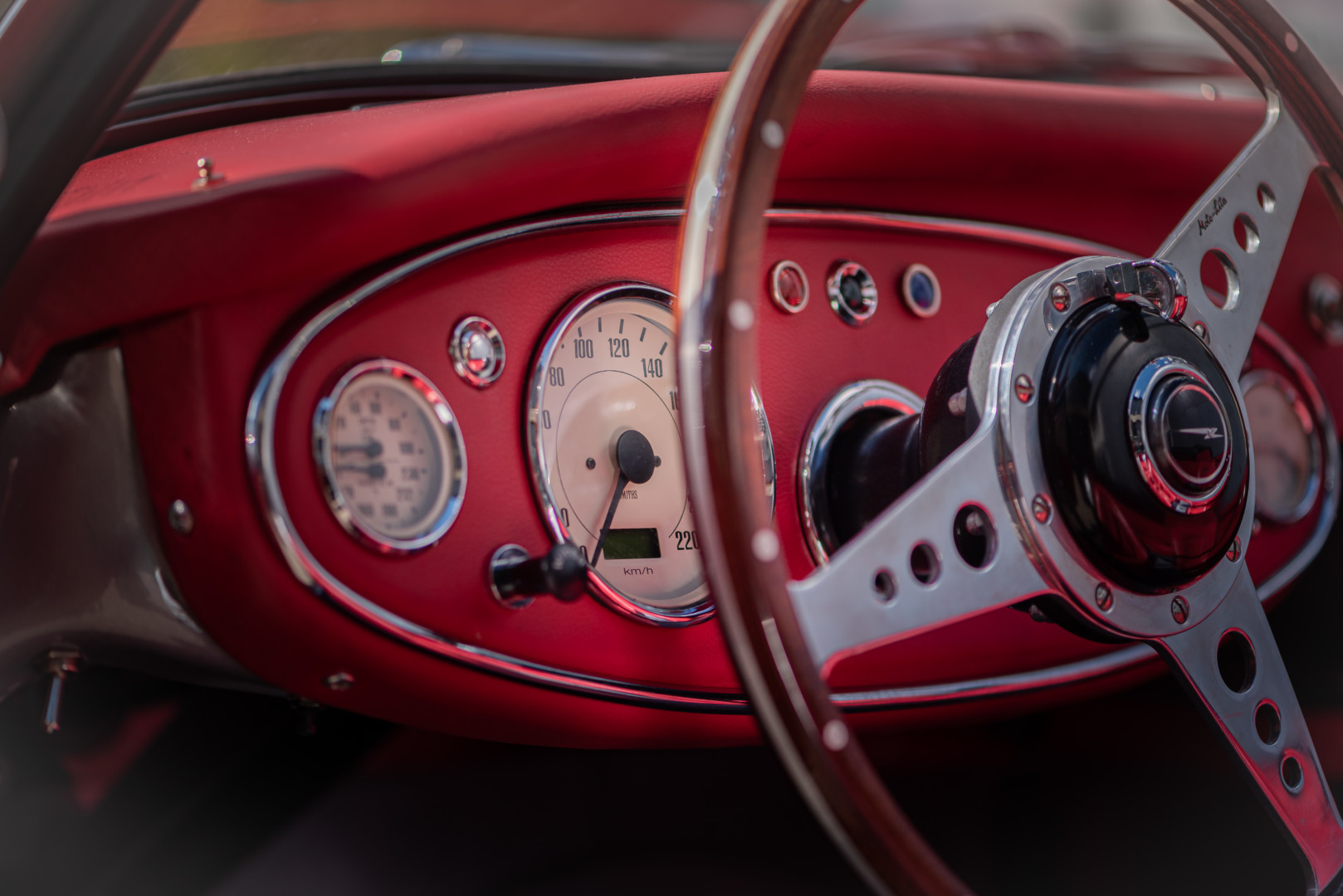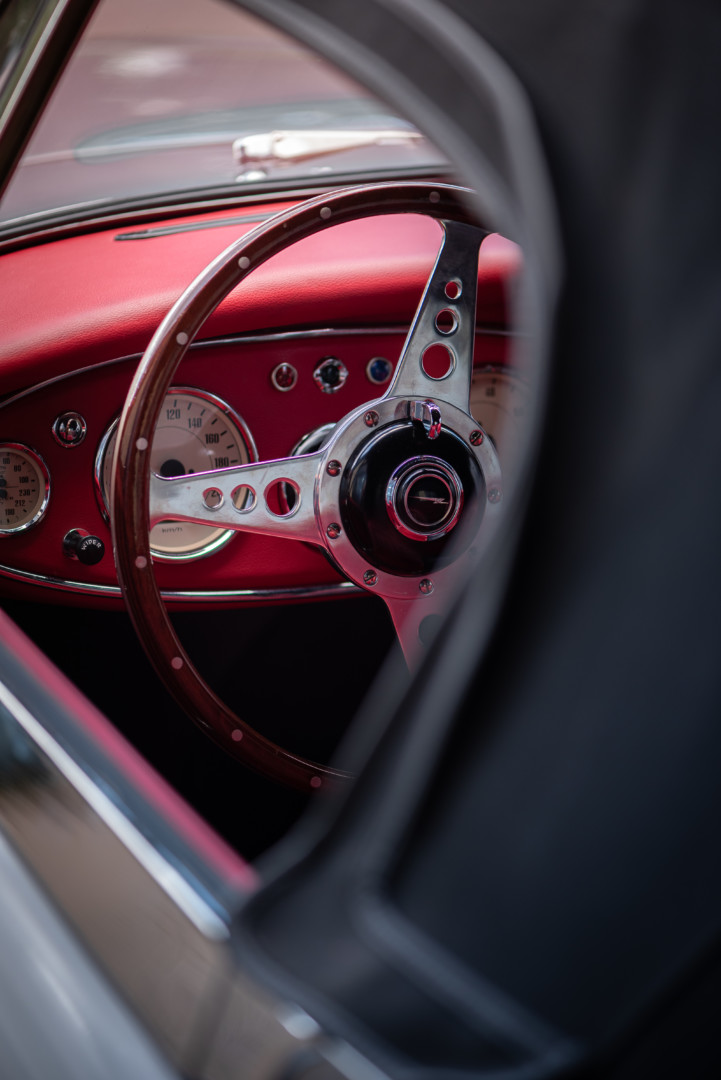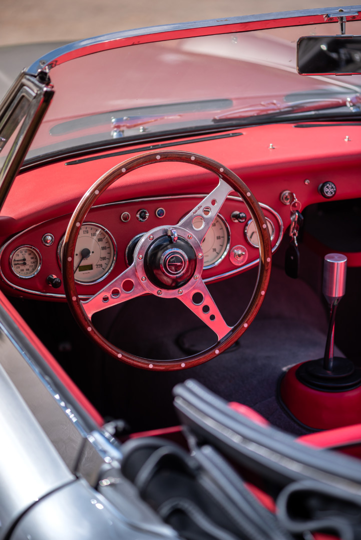La sellerie en cuir rouge sort de restauration, ainsi que son capotage en alpagua noir.