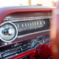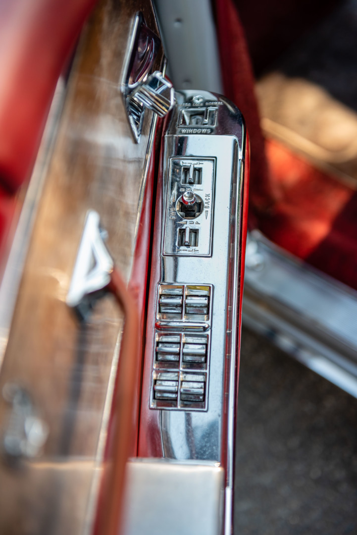 L’intérieur est superbe : les cuirs rouge d’origine sont en excellent état, seul une couture fait des siennes, et les moquettes d’origine sont impeccables. La capote électrique et les boiseries sont également d’origine et bien conservés.
