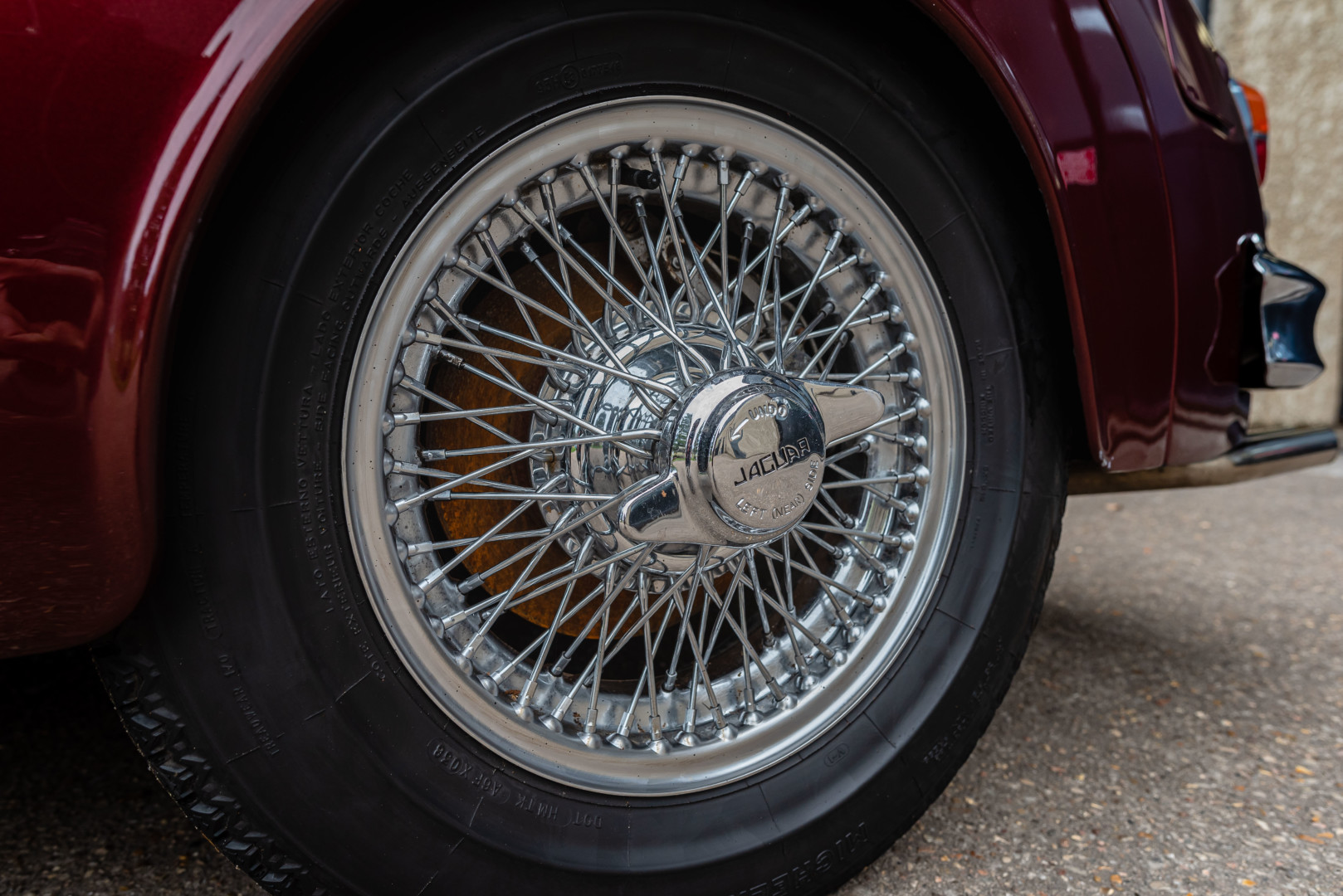 Cette Jaguar est équipée de freins à disque à l’avant et à l’arrière, avec étriers 4 pistons, garantissant un freinage performant pour l’époque.