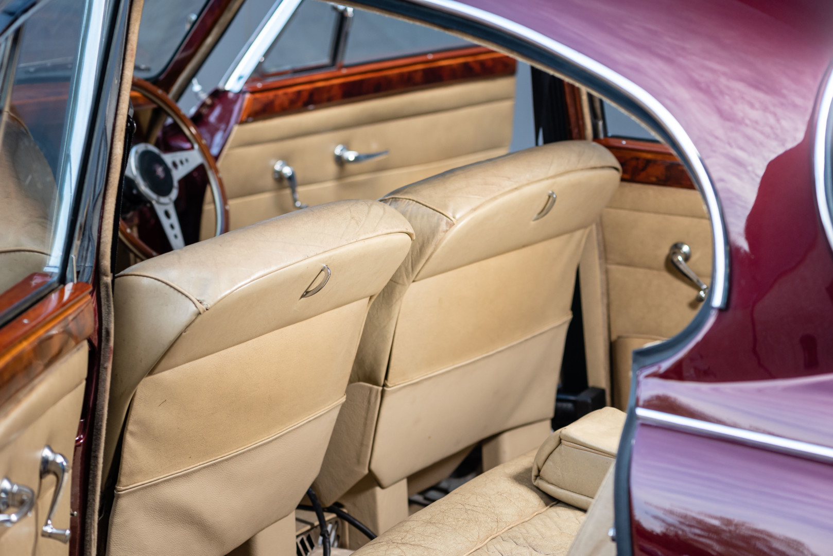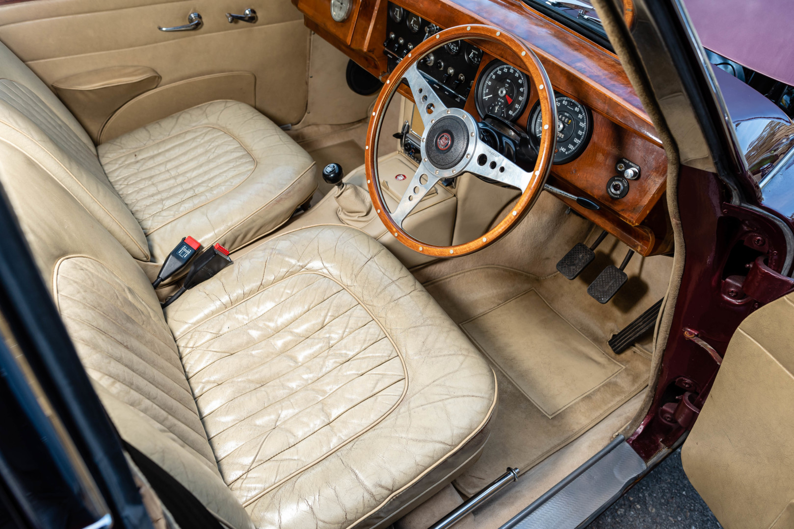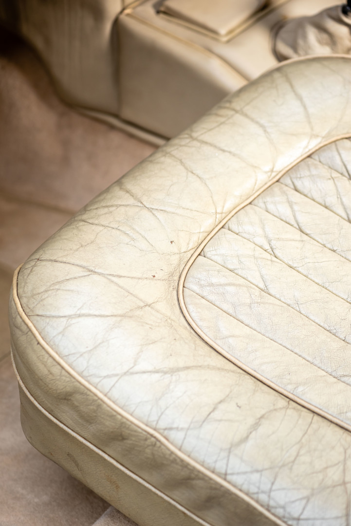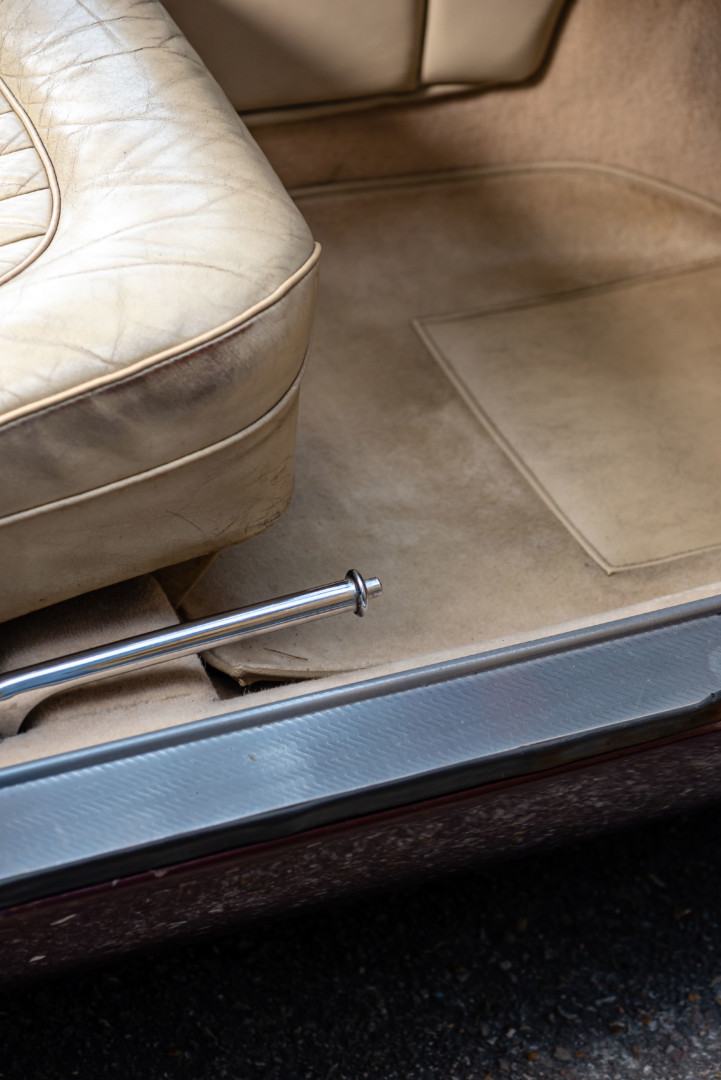 La sellerie en cuir beige, très probablement d’origine, est en superbe état et présente une patine remarquable, en parfaite adéquation avec l’âge de la voiture.