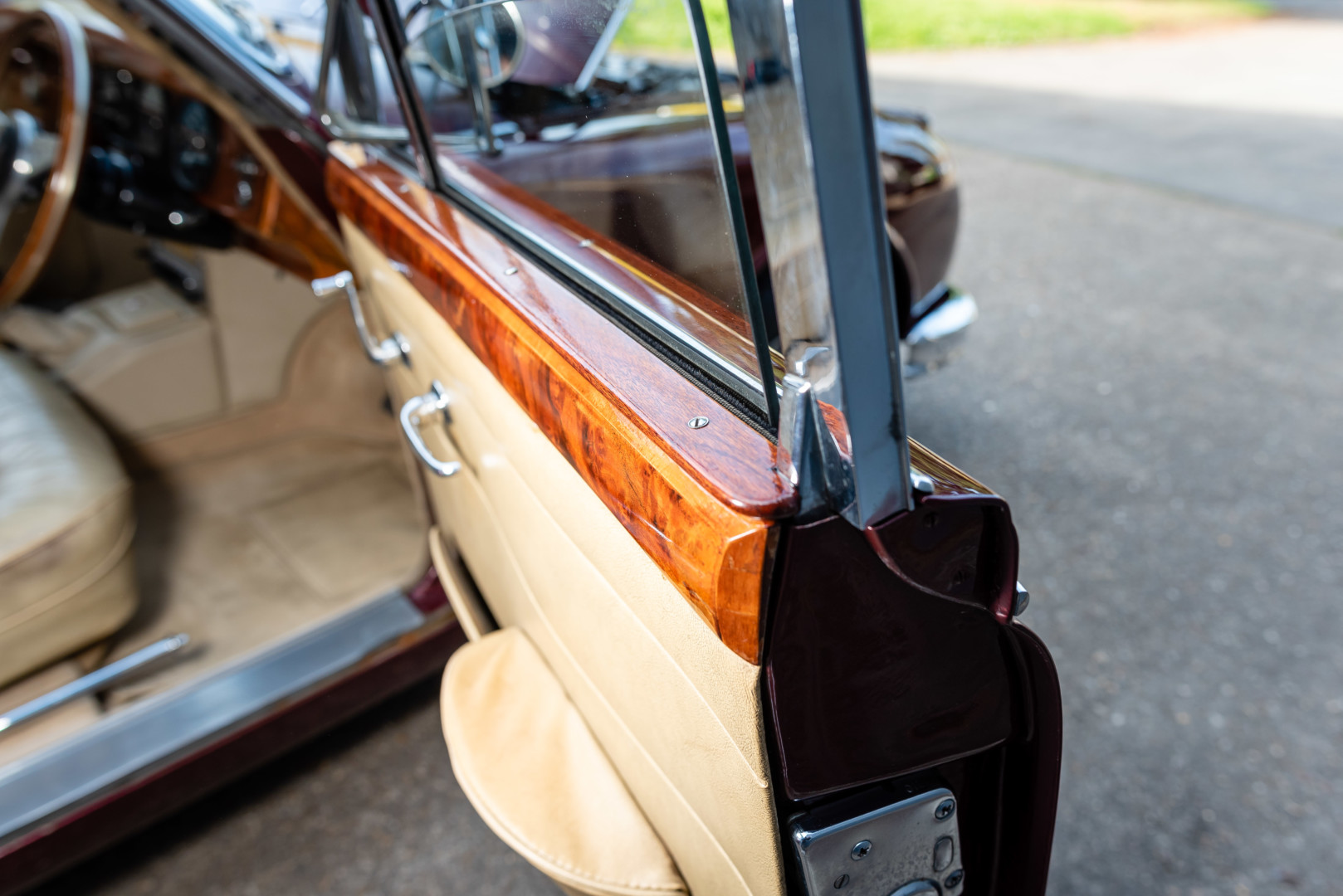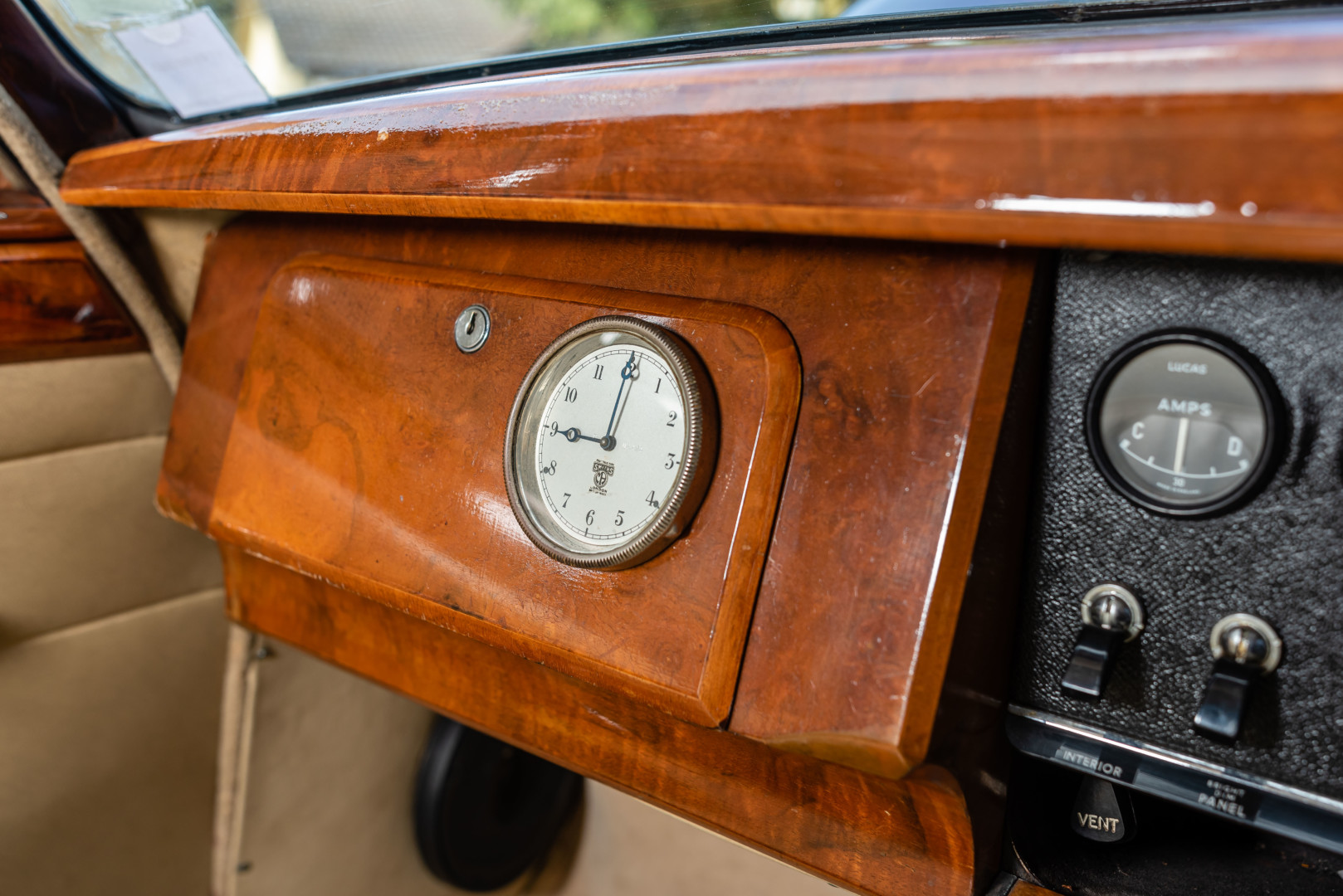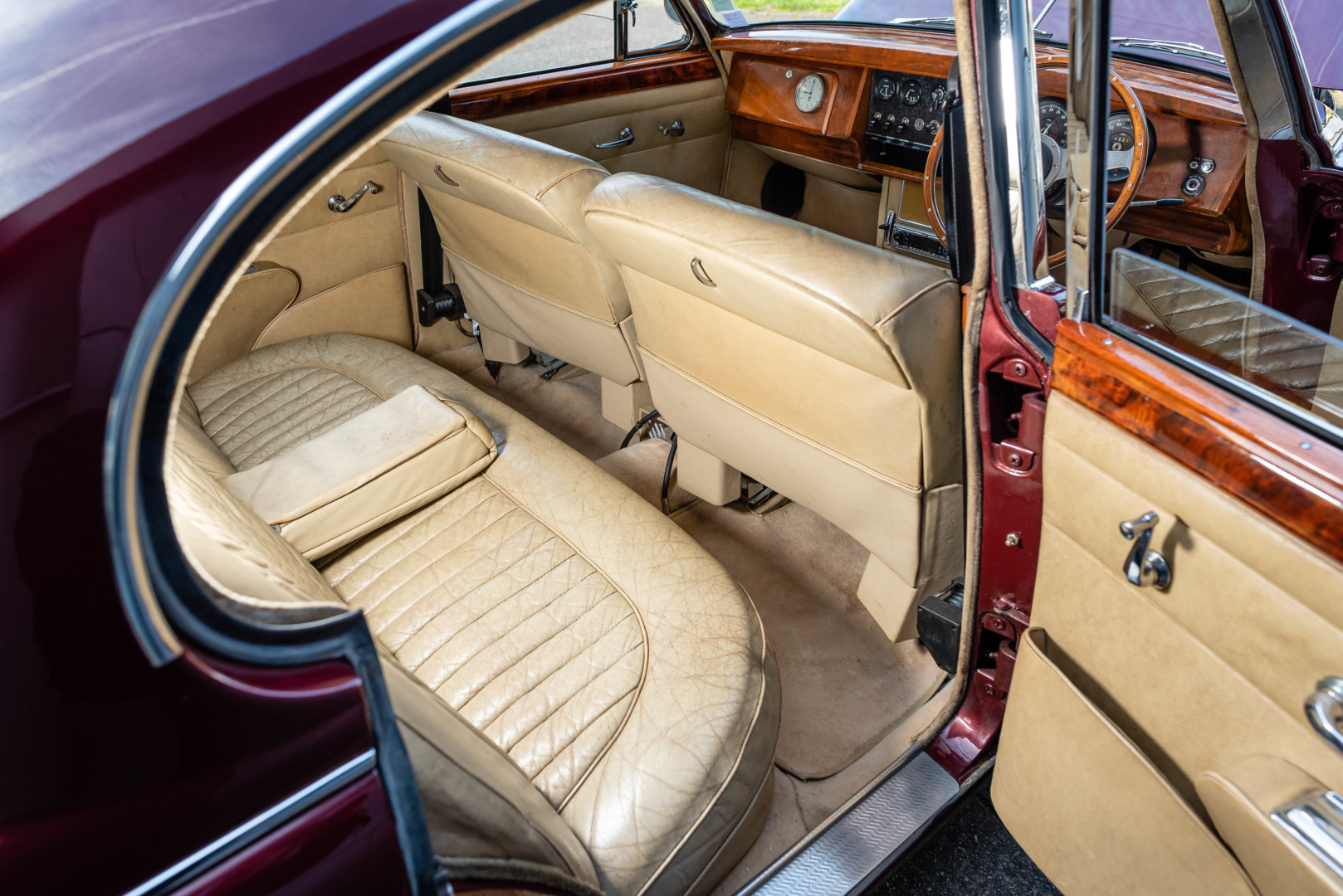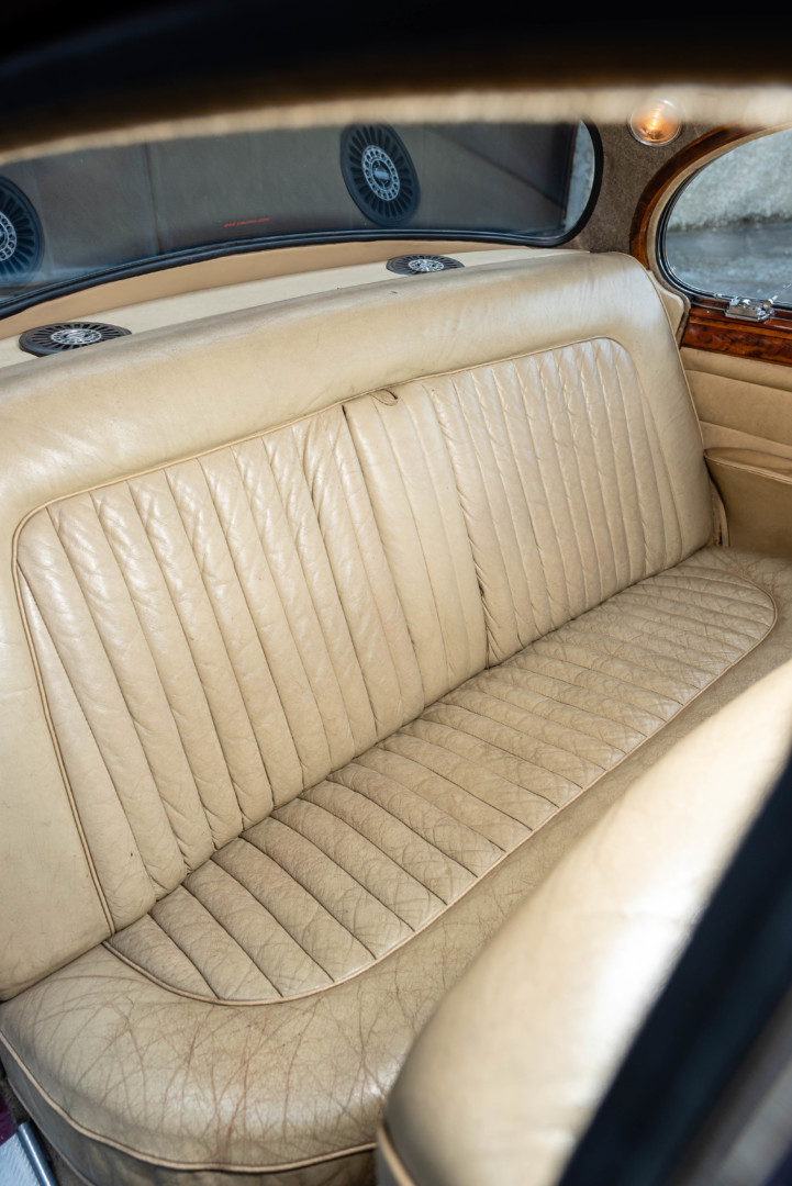 La sellerie en cuir beige, très probablement d’origine, est en superbe état et présente une patine remarquable, en parfaite adéquation avec l’âge de la voiture.