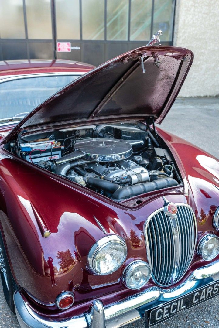 La version 3.4L, positionnée entre la 2.4L et la 3.8L, est équipée du célèbre moteur XK six cylindres en ligne de 3 442 cm³. Ce moteur développe environ 210 chevaux, offrant un excellent compromis entre performances et souplesse d’utilisation. Associé à une boîte manuelle avec overdrive ou à une transmission automatique selon les configurations, il permet à la MKII d’atteindre des performances remarquables pour une berline de cette catégorie dans les années 1960.