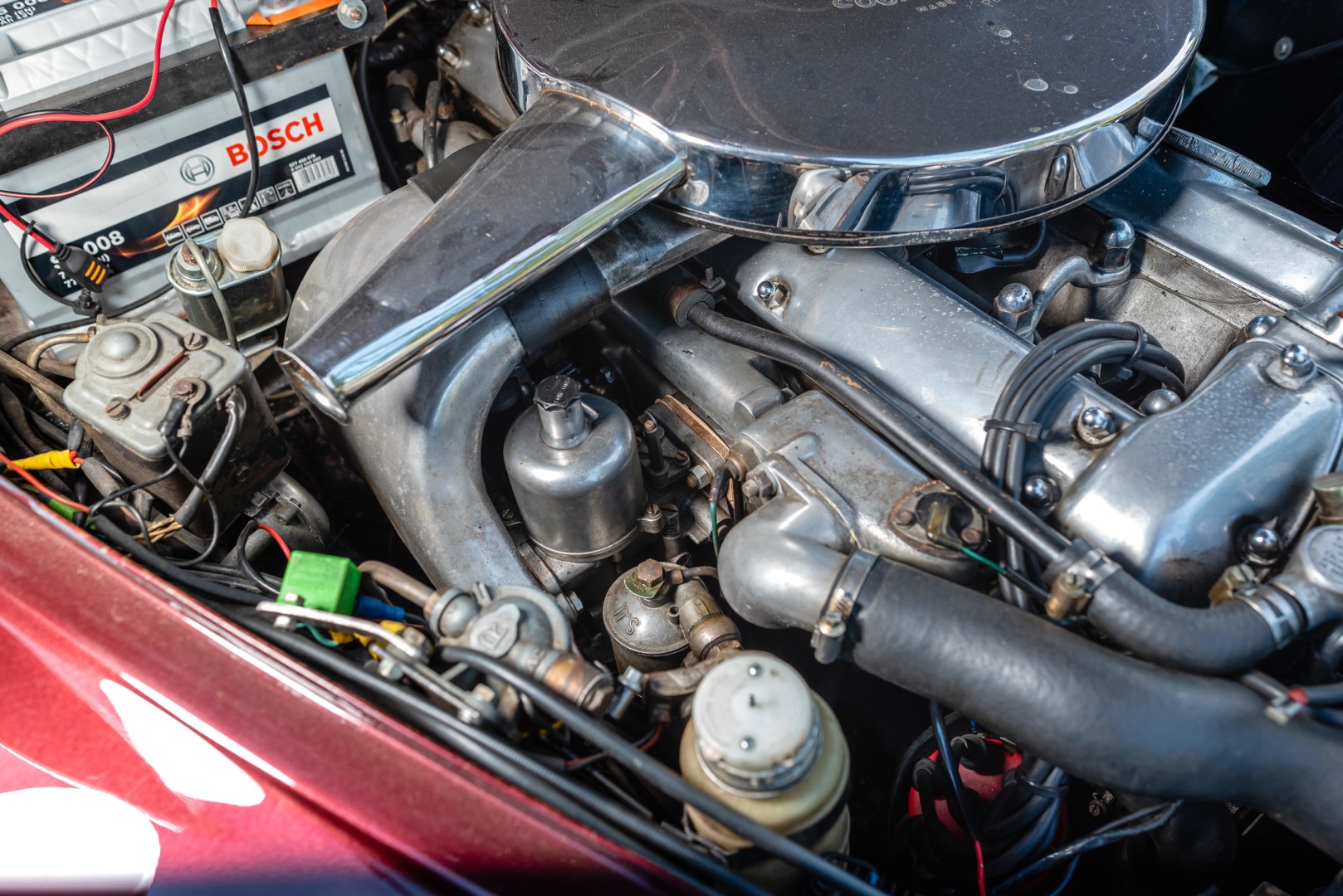 La carrosserie a été reprise et repeinte en teinte Maroon dans nos ateliers en 2006.