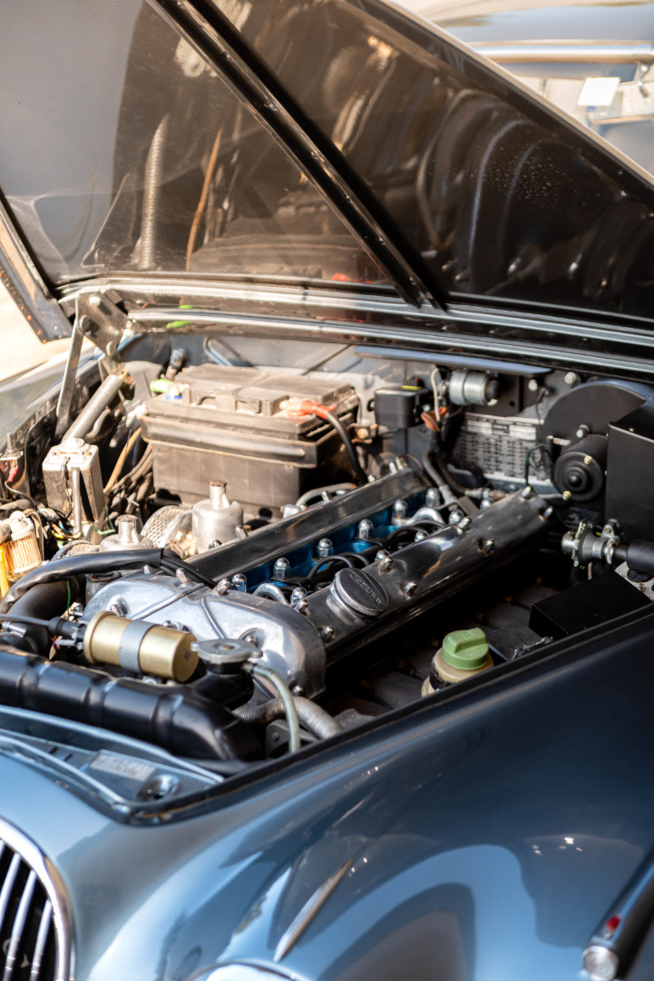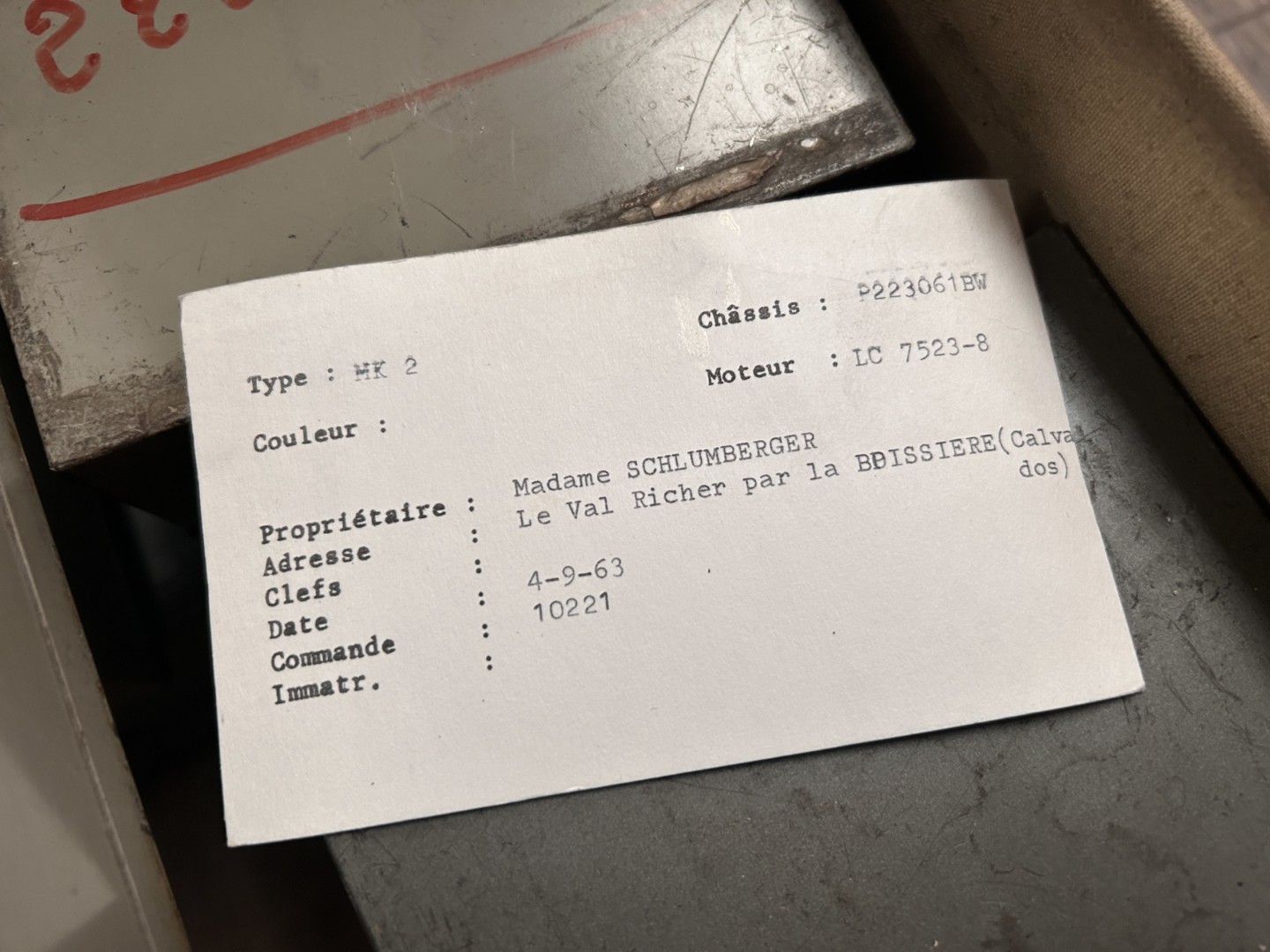 Nos archives confirme qu'elle fut livrée neuve en France le 12 septembre 1963 à sa première propriétaire Madame Schlumberger à La Boissière dans le Calvados. Elle est sortie d'usine Gunmétal avec un intérieur cuir beige. Grace à son dossier de facture important, nous pouvons retracer son historique de propriété depuis 1995.