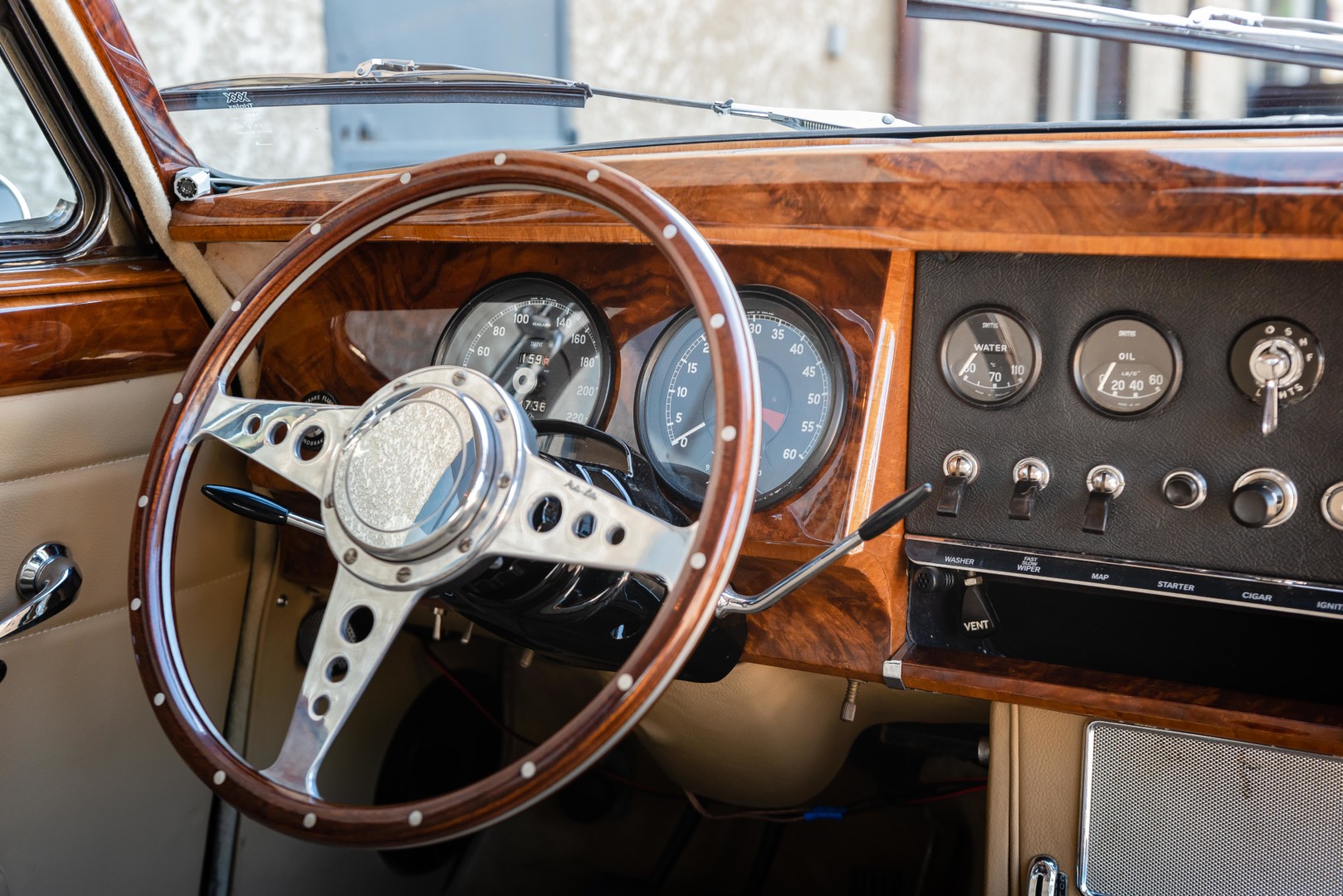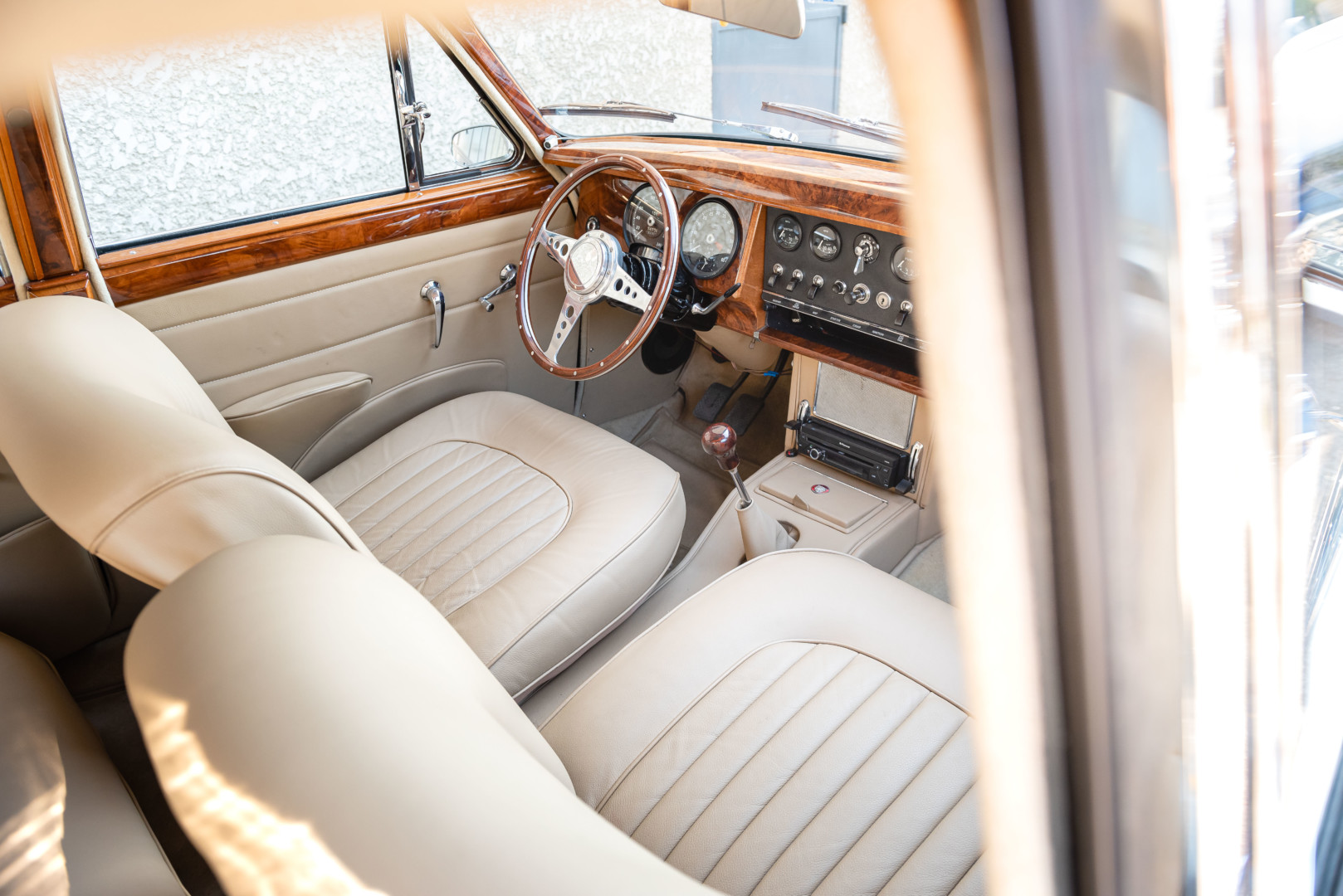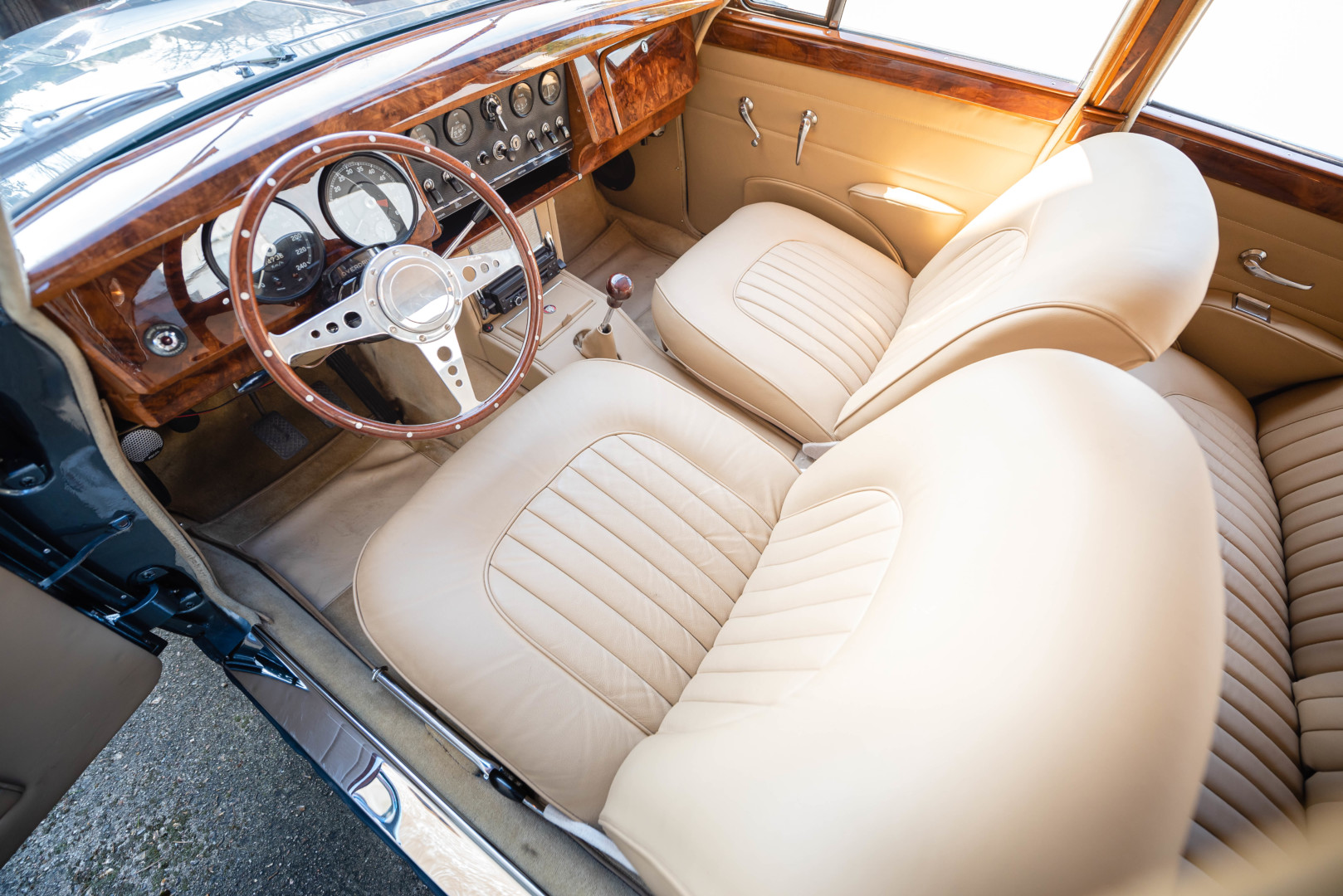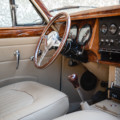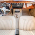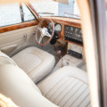 Sa sellerie en cuir beige a également été restaurée en 2021. Les moquettes sont propres ainsi que les panneaux de portes et le ciel de toit. Le tableau de bord en bois sort de restauration et elle possède un volant en bois également.
