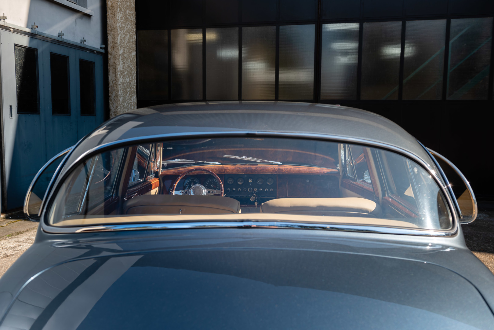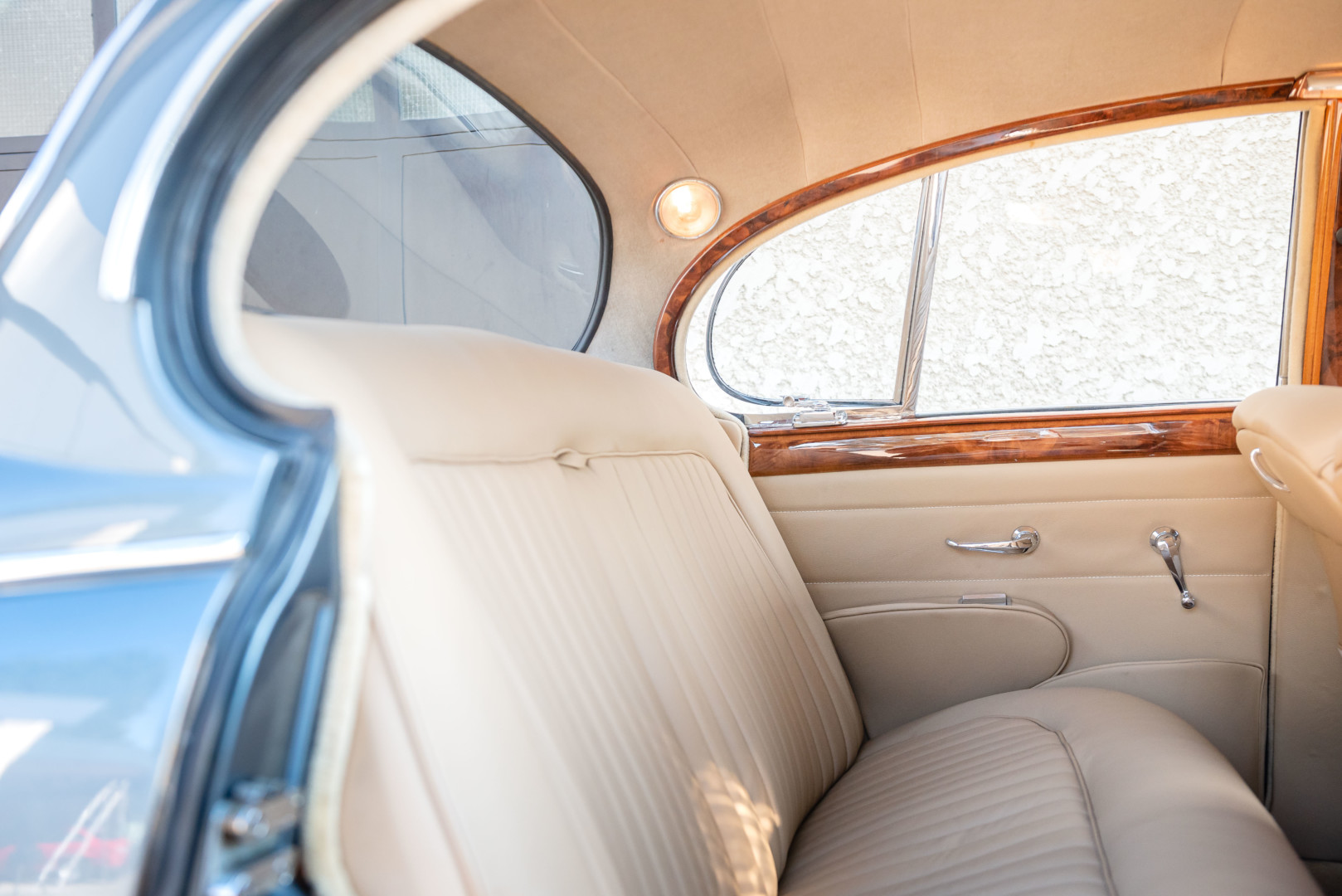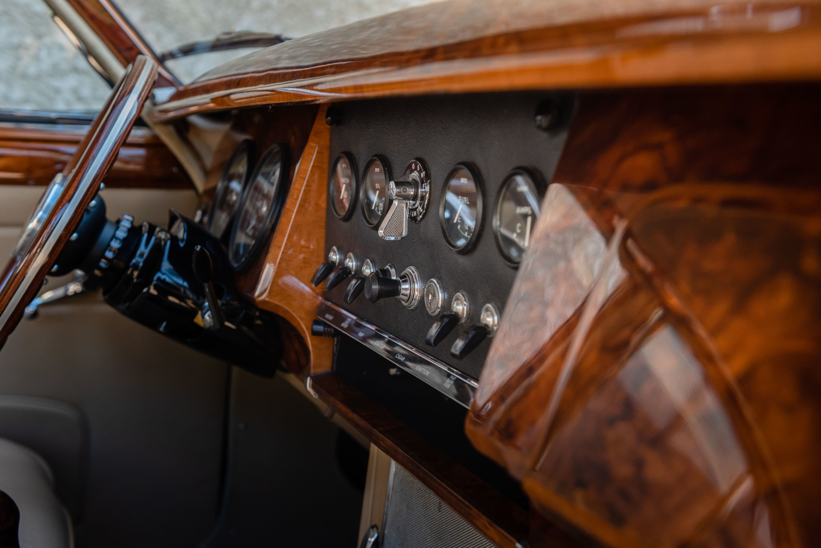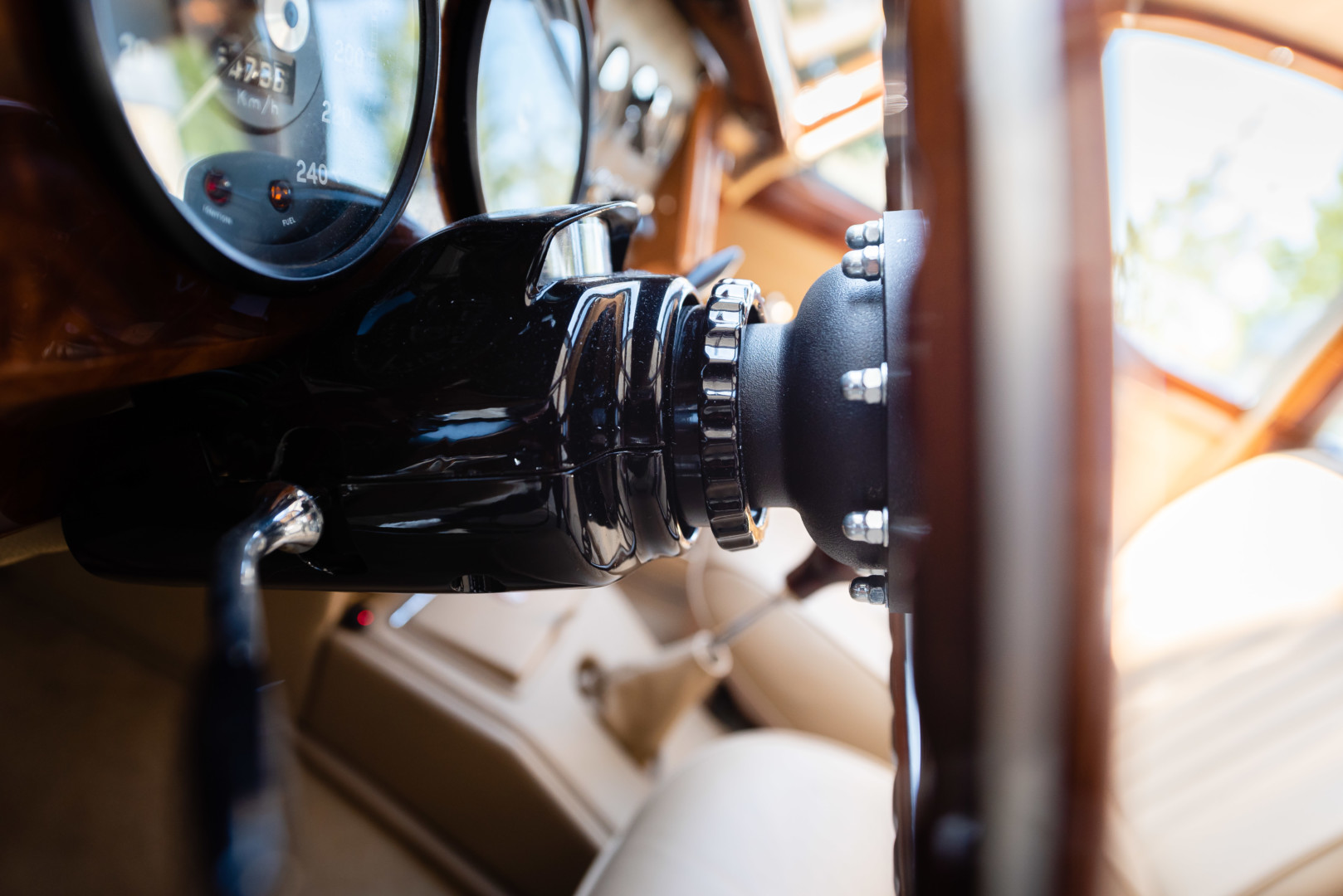 Sa sellerie en cuir beige a également été restaurée en 2021. Les moquettes sont propres ainsi que les panneaux de portes et le ciel de toit. Le tableau de bord en bois sort de restauration et elle possède un volant en bois également.
