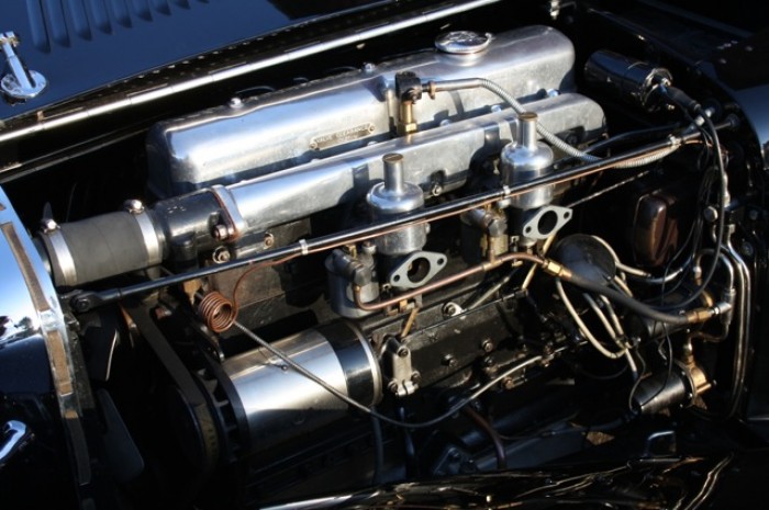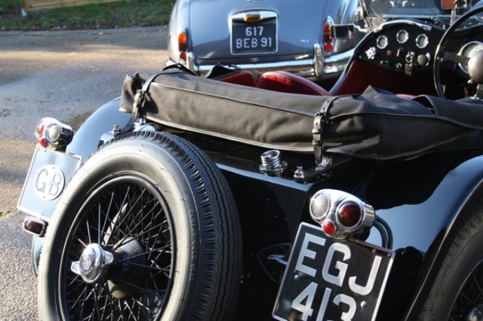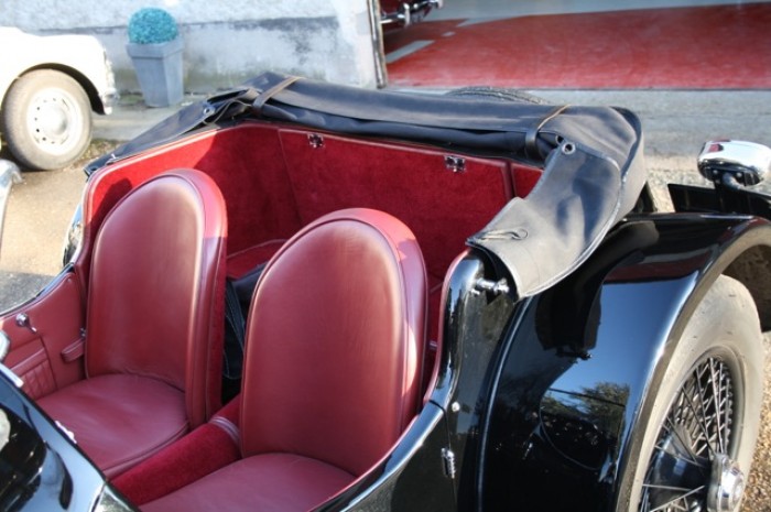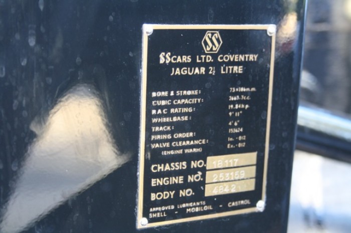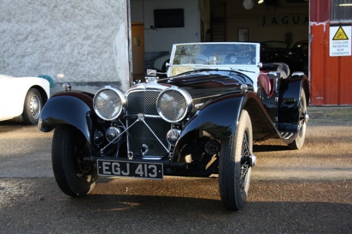 Cette SS 100 est toujours immatriculée en Angleterre avec ses plaques d'origine EGJ 413, vendue neuve à Londres le 20 Juillet 1937. Carroserie et sellerie refaite à neuf au Royaume Unis, c'est une voiture en parfait état de marche.