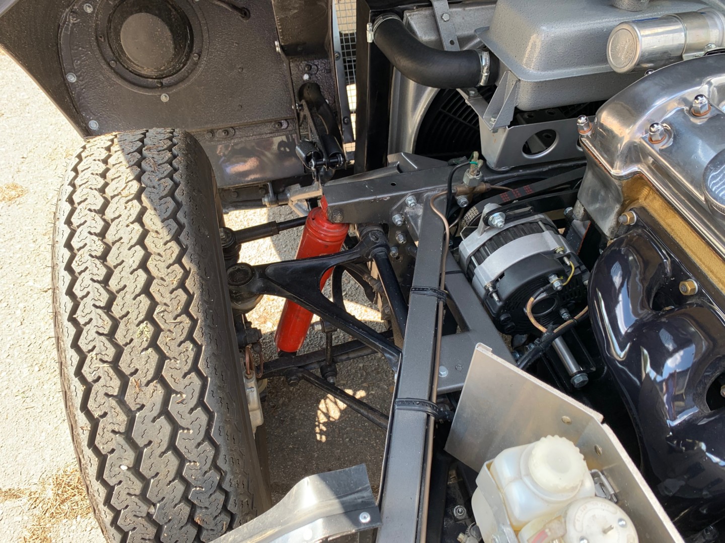 Les trains avant et arrière ont été reconditionnés, la tenue de route est parfaite. Le comportement du châssis est excellent. Aucuns jeux ou bruits anormaux ne sont relevés. La suspension est parfaite. Elle possède des jantes chromées et des pneumatiques neufs.