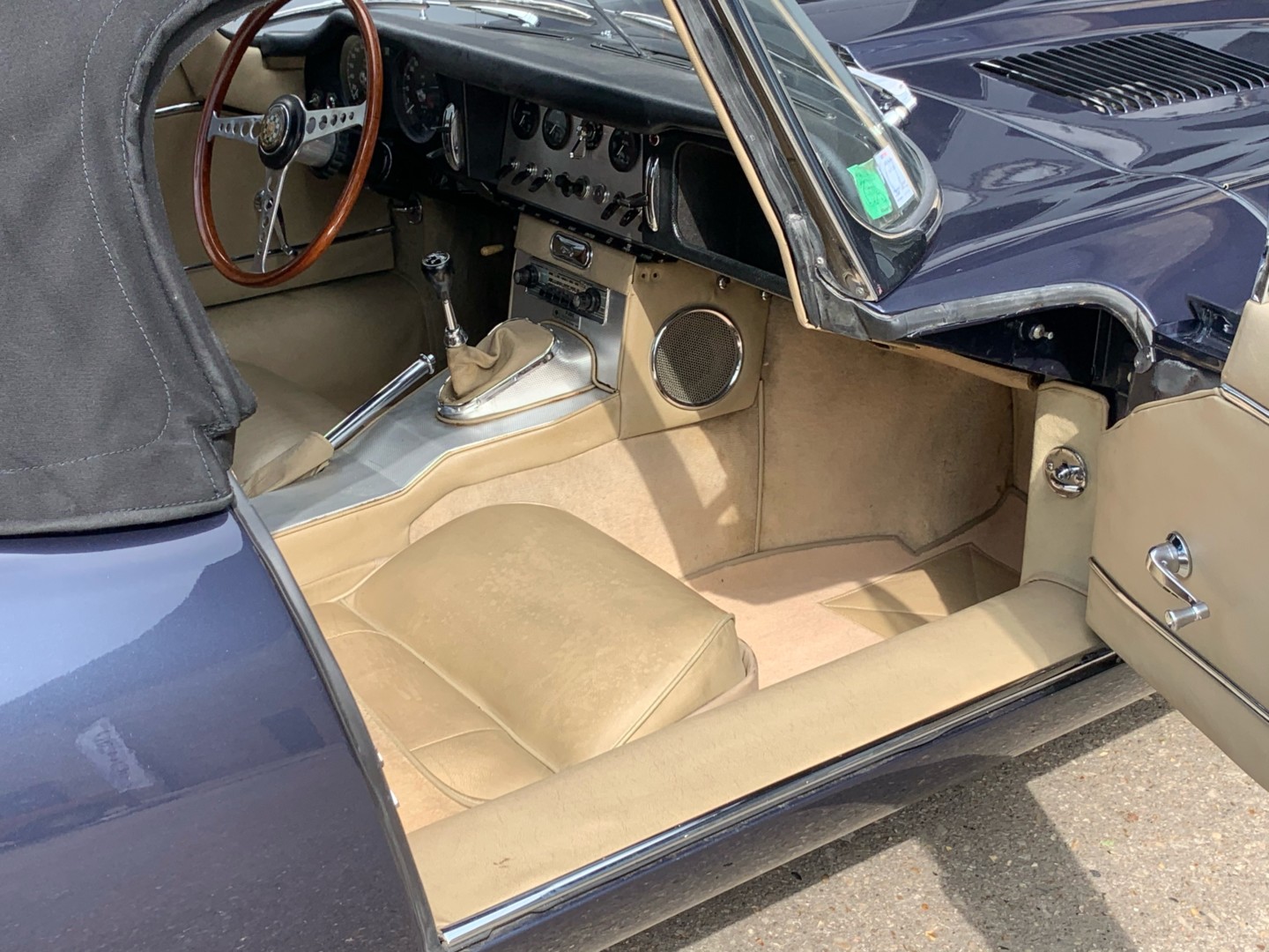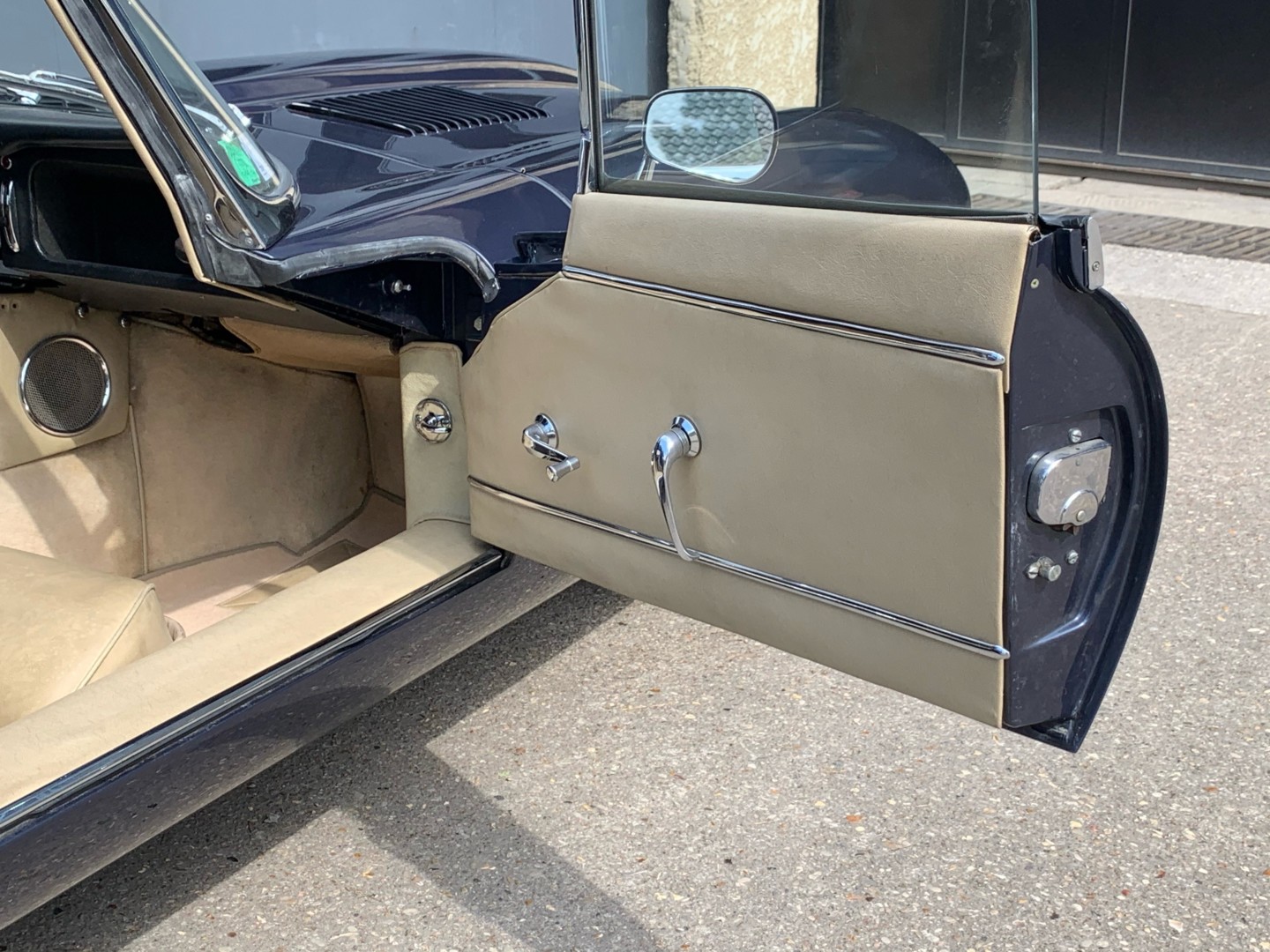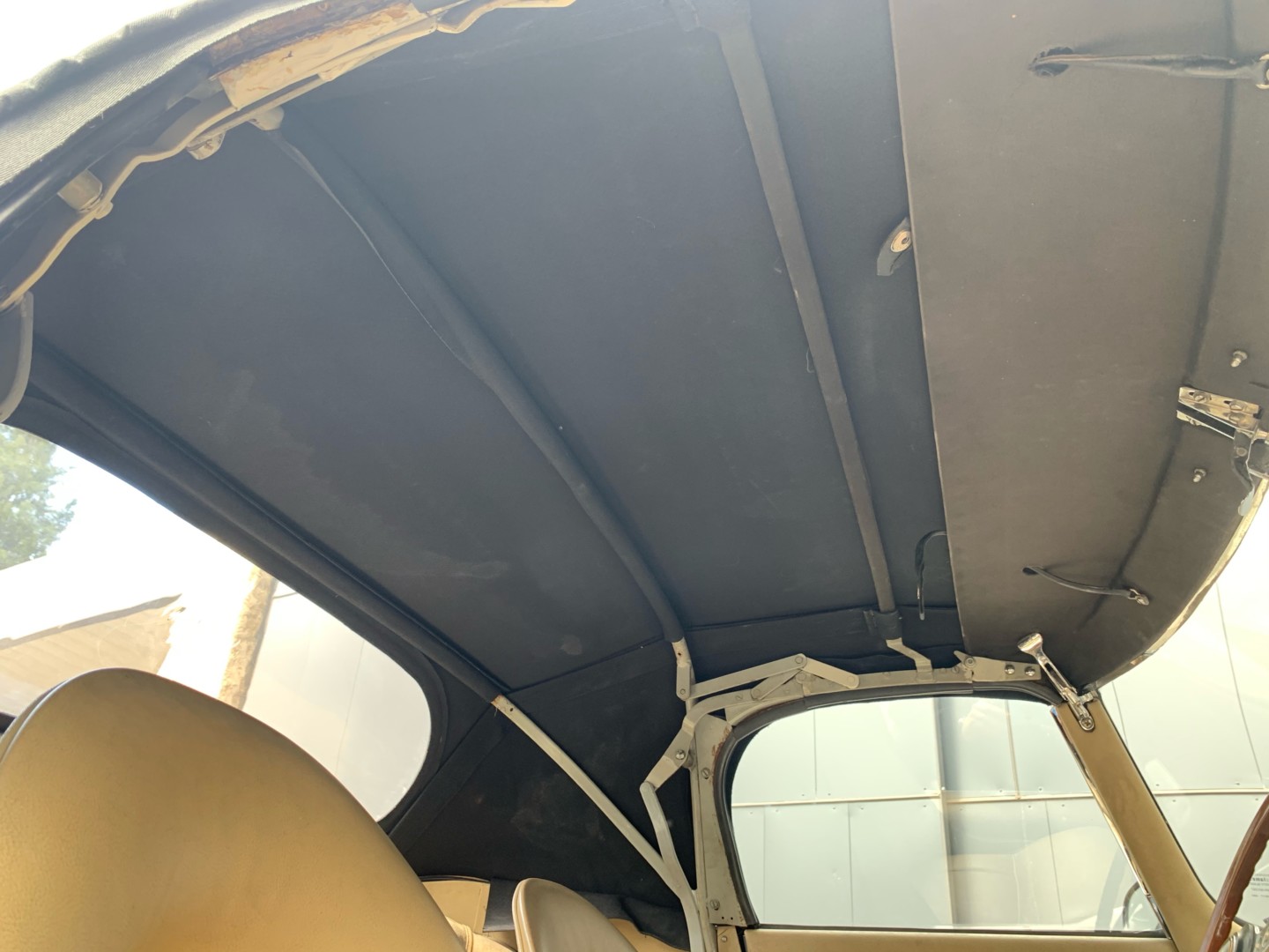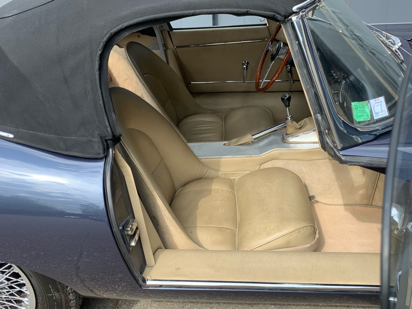 Elle possède encore sa sellerie d'origine beige avec une belle patinée. Les moquettes et la capote sont neuves.