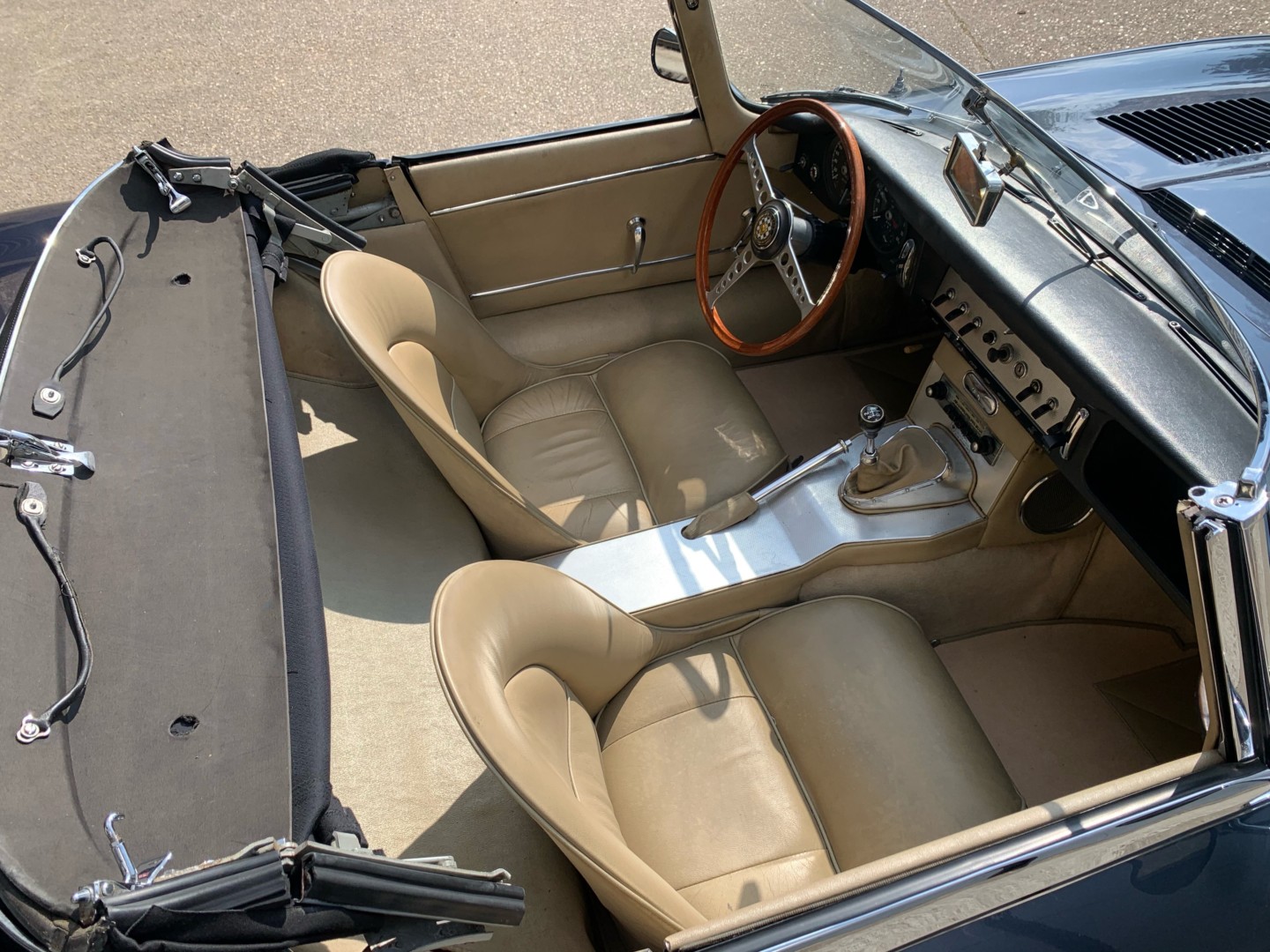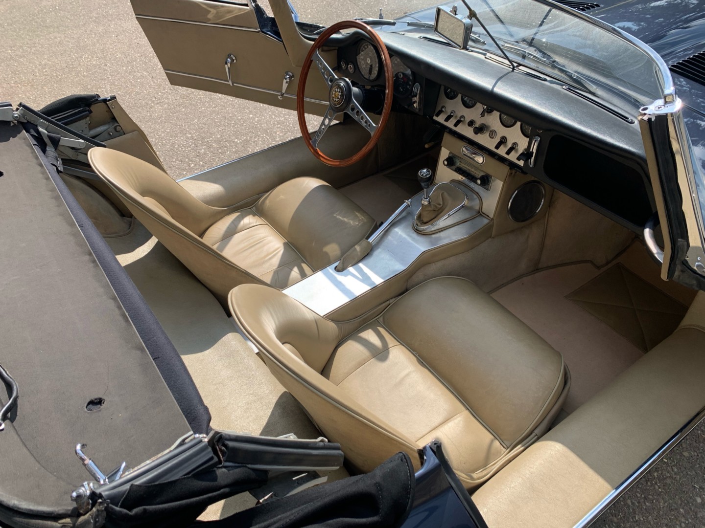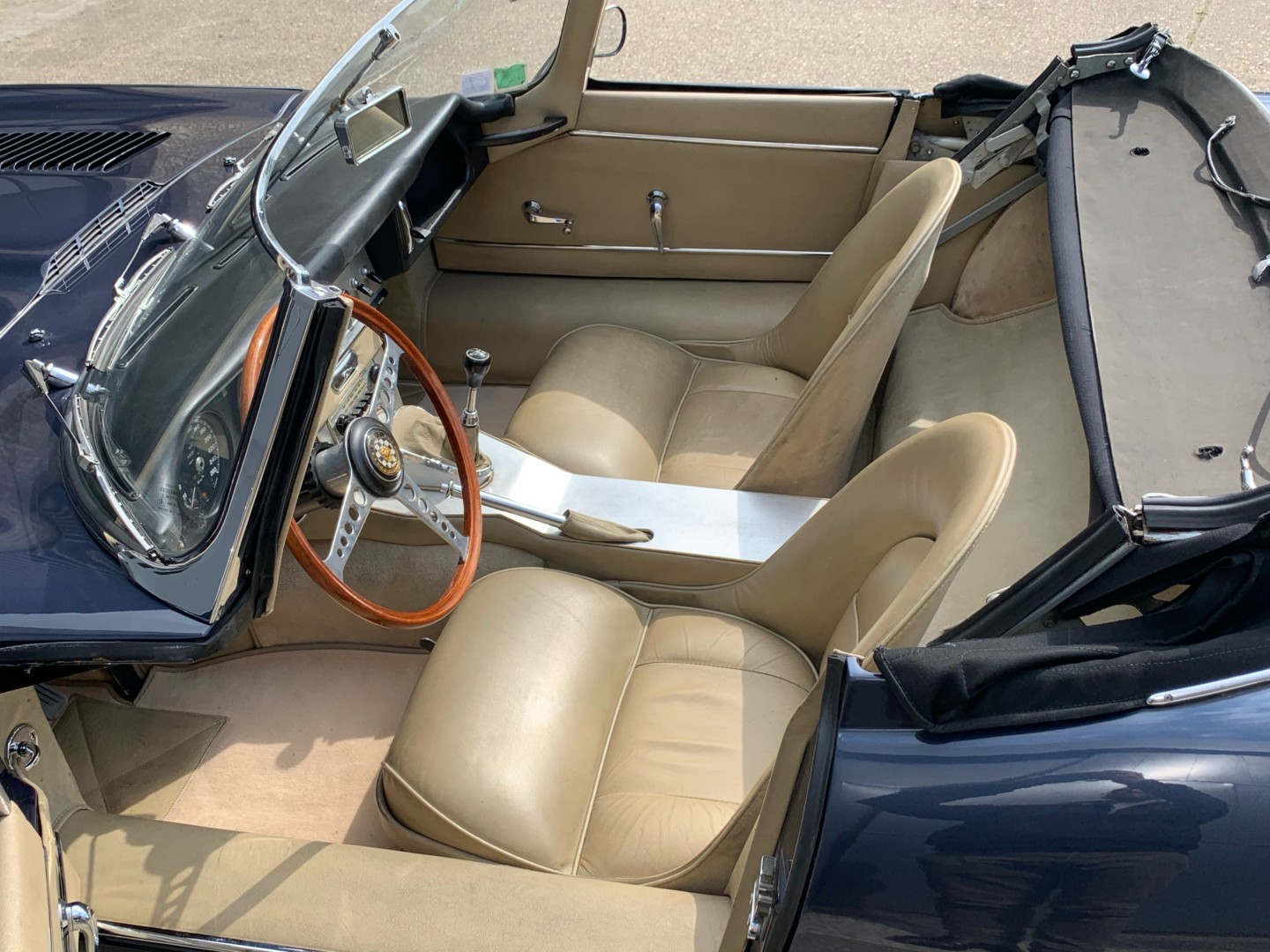 Elle possède encore sa sellerie d'origine beige avec une belle patinée. Les moquettes et la capote sont neuves.
