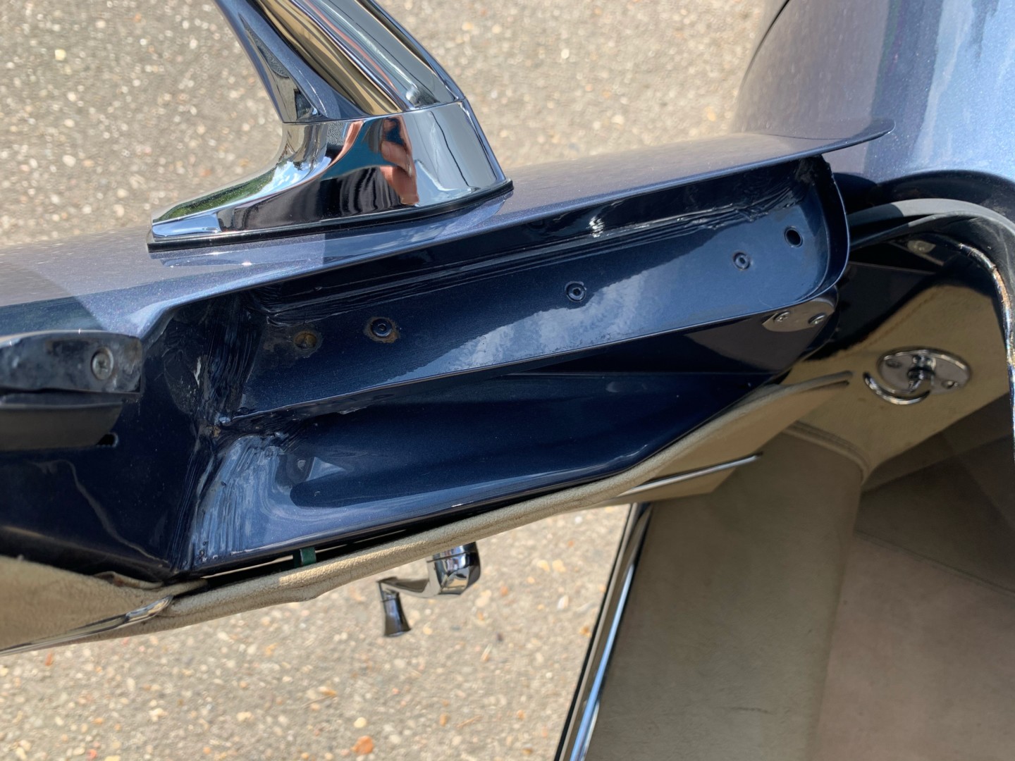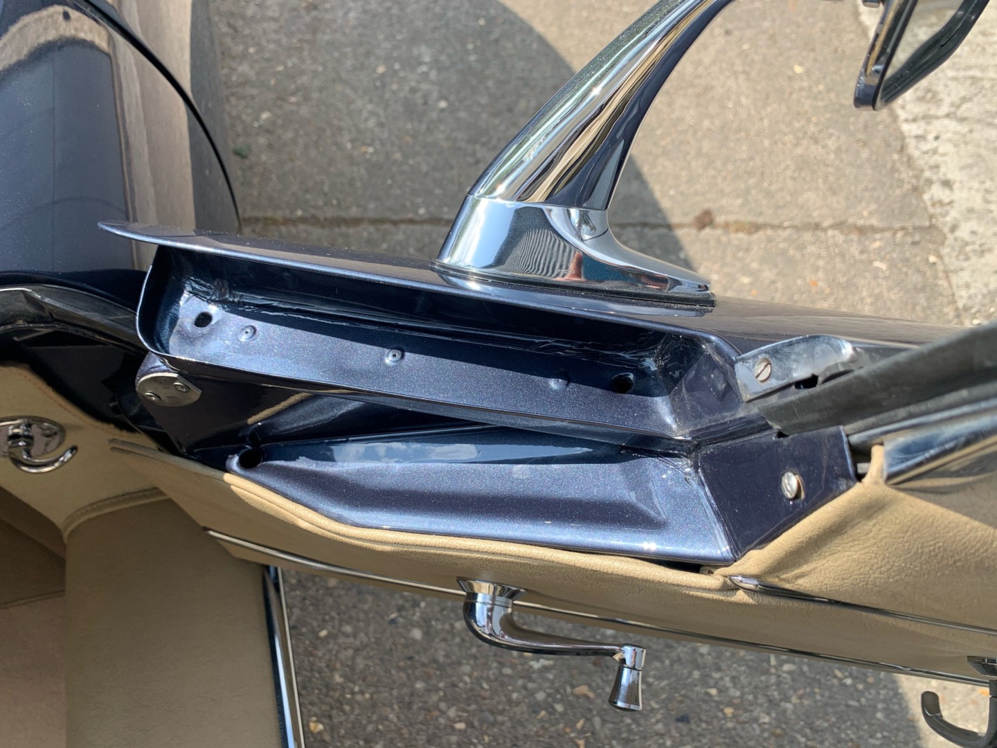 Toujours dans sa couleur d'origine "Opalescente Dark Blue", la carrosserie est très saine, sans corrosion et en excellent état. Les jours de portes et de capots sont excellents. La structure Eiffel est bonne ainsi que les bas de caisse.
