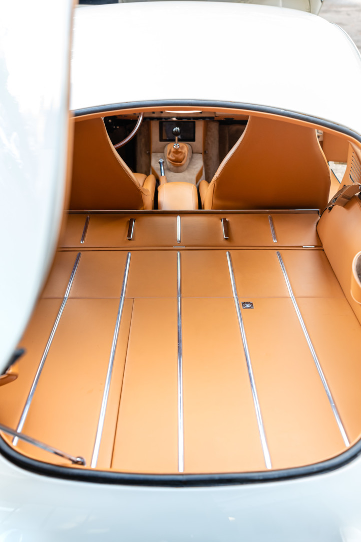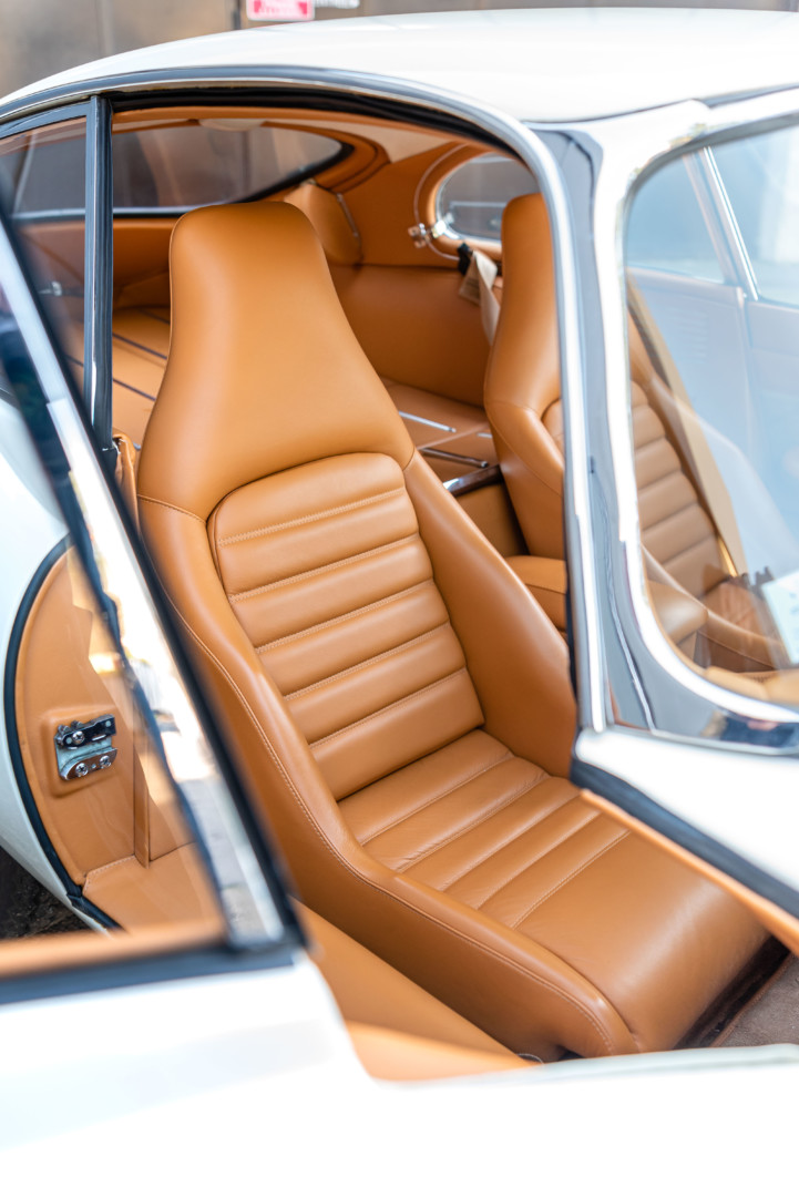 Livrée neuve en juillet 1965 à Saint-Cloud (92), cette Jaguar Type E arborait à l’origine une élégante teinte Golden Sand associée à un intérieur en cuir beige. Après plusieurs décennies discrètes, elle réapparaît en 2018 à Lyon, conservée avec soin par son propriétaire des vingt dernières années. Séduit par son authenticité, nous en faisons alors l’acquisition.