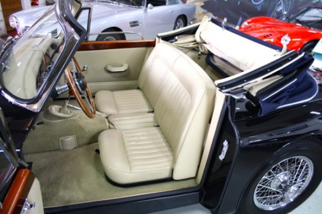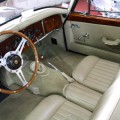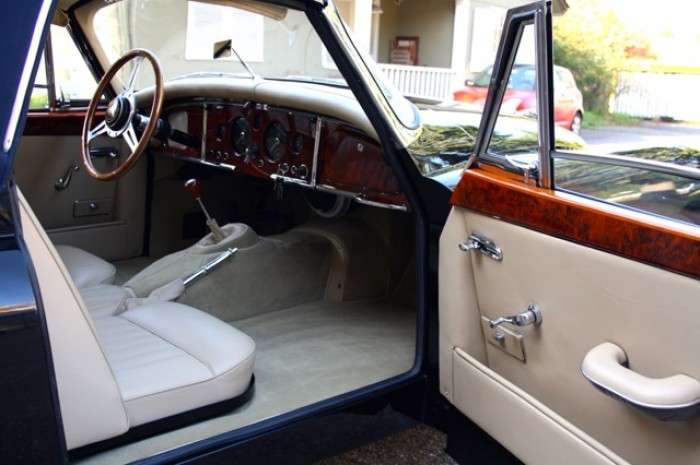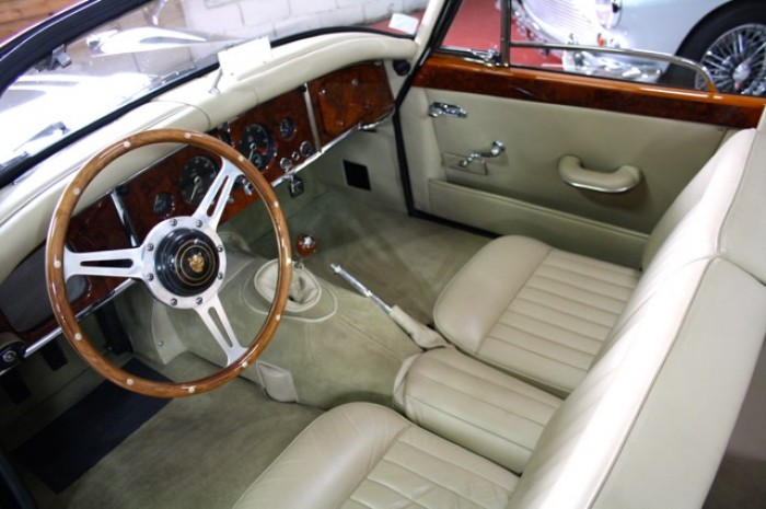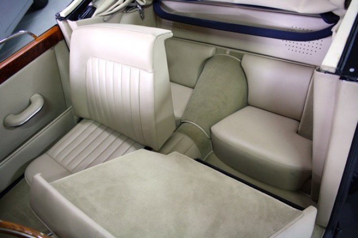 Elle est entretenue chez nous depuis sa restauration sa sellerie en cuir beige confectionnée sur mesure est en excellent état. La carrosserie ayant été mise à nu la qualité de la peinture est absolument parfaite. Le capotage en alpaga bleu marine est irréprochable.