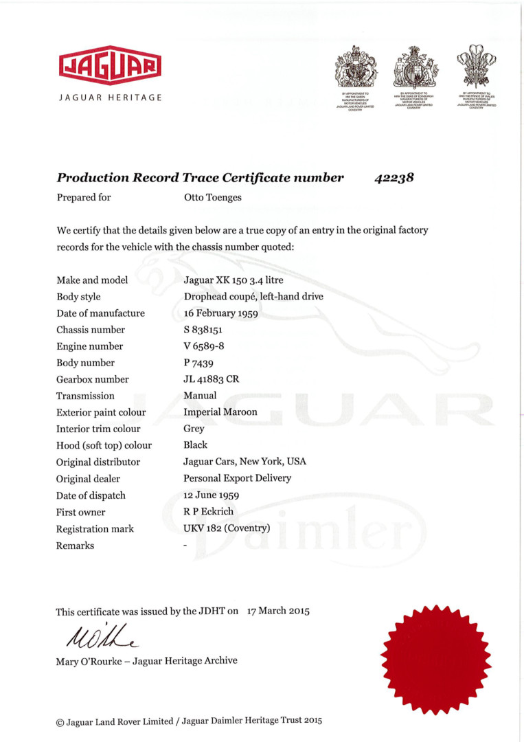 Mr Eckrich achète cette voiture neuve en 1959, puis Mr Willson l’acquiert en 1967. Elle change de mains en 1978 sans être immatriculée. Un allemand l’achète dans les années 2010 et la restaure intégralement en Allemagne. En 2021, cette Jaguar, désormais comme neuve, est achetée par son dernier propriétaire, un français.