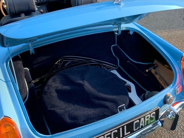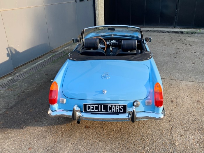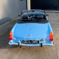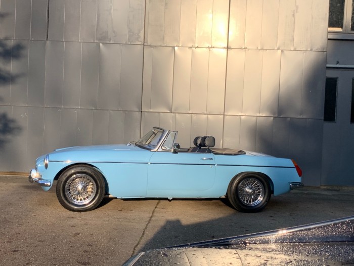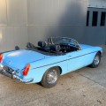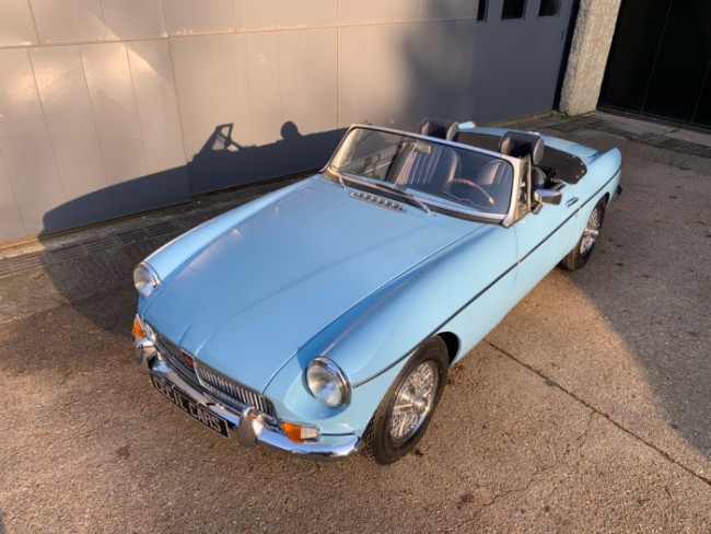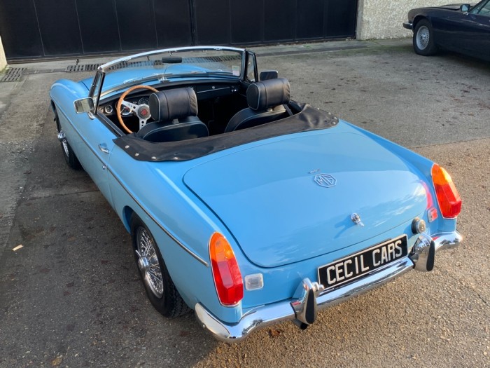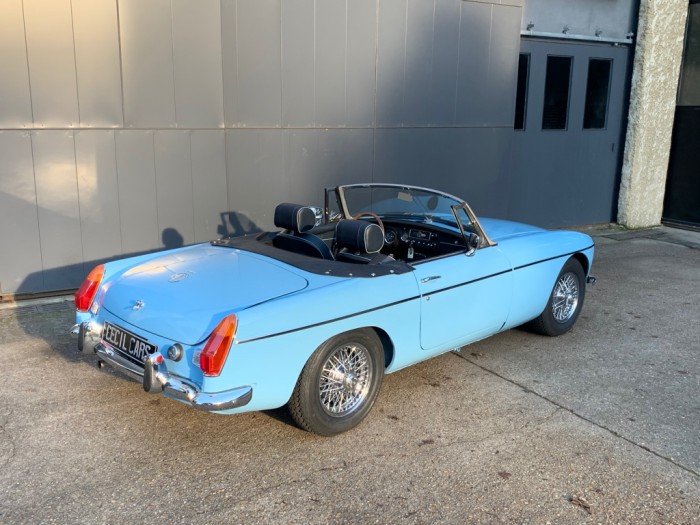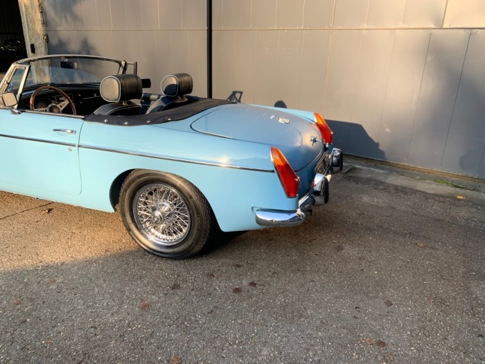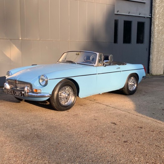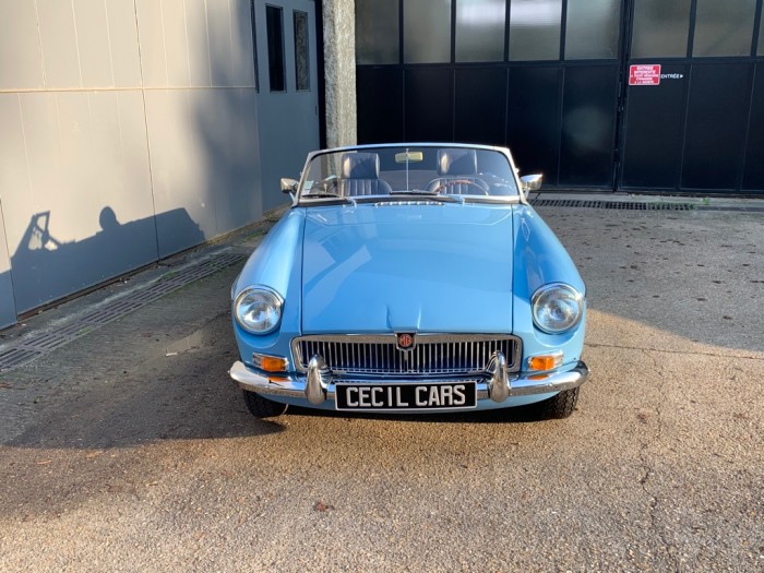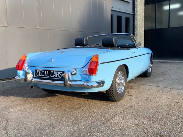 Lancée en 1962, la B est l'héritière des TC et TF d'après-guerre mais surtout de la MG A, elle sera la première à vraiment prendre en considération les attentes du marché américain, qui s'est pris de passion pour les MGA. Plus confortable, moins dépouillé avec vitres latérales et capote, plus performante et plus habitable. Ainsi, elle reçoit une caisse monocoque plus rigide et se voit équipé d'un 4 cylindres 1.8L. Ce bloc, dérivé du moteur 1 622 cm3 de la MG A, développe 95 ch et propulse la B à près de 170 km/h.