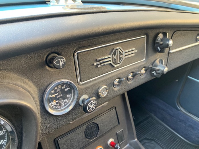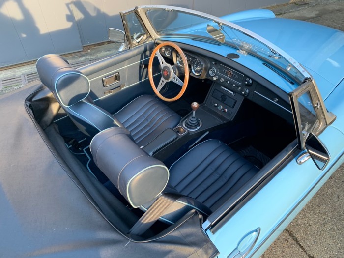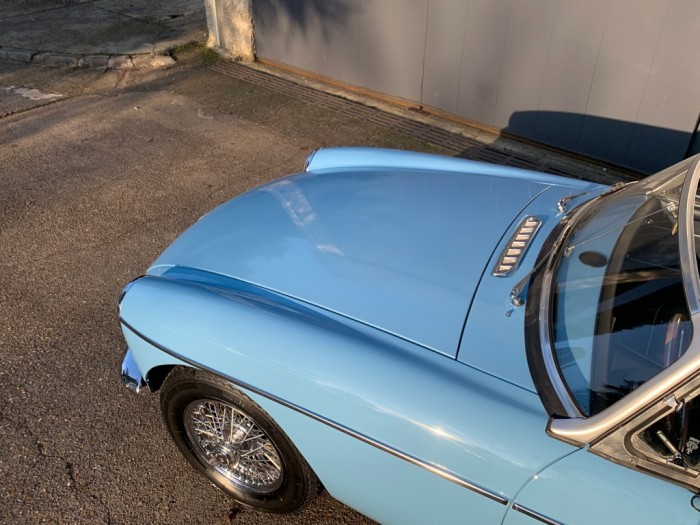 Cette magnifique MG B possède une excellente carrosserie, très saine avec des ajustements excellents. Un grand travail a été effectué sur la carrosserie avec un remplacement des planchers et font de coffre, sa peinture neuve a une brillance éclatante, une calandre de la version 1969 chromée a été installée.