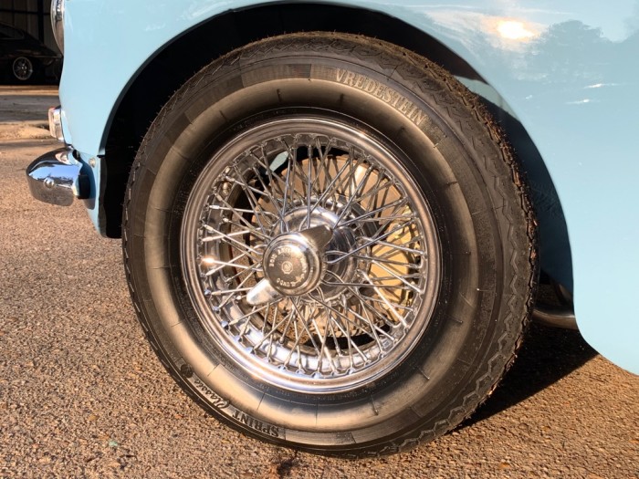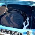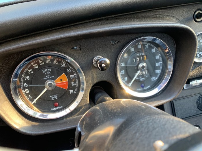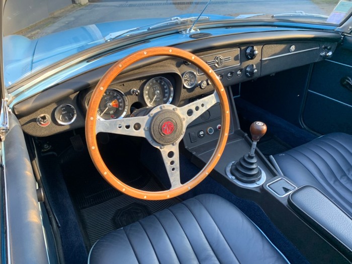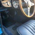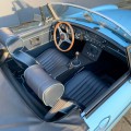Sa sellerie en cuir bleu et liseré bleu ciel est en excellant état. Les moquettes ainsi que les panneaux de portes sont neufs, un tableau de bord de la version 1969 a été installée.