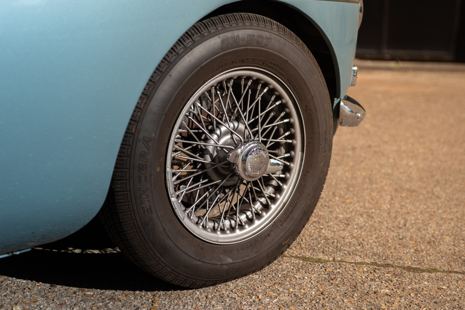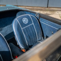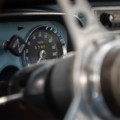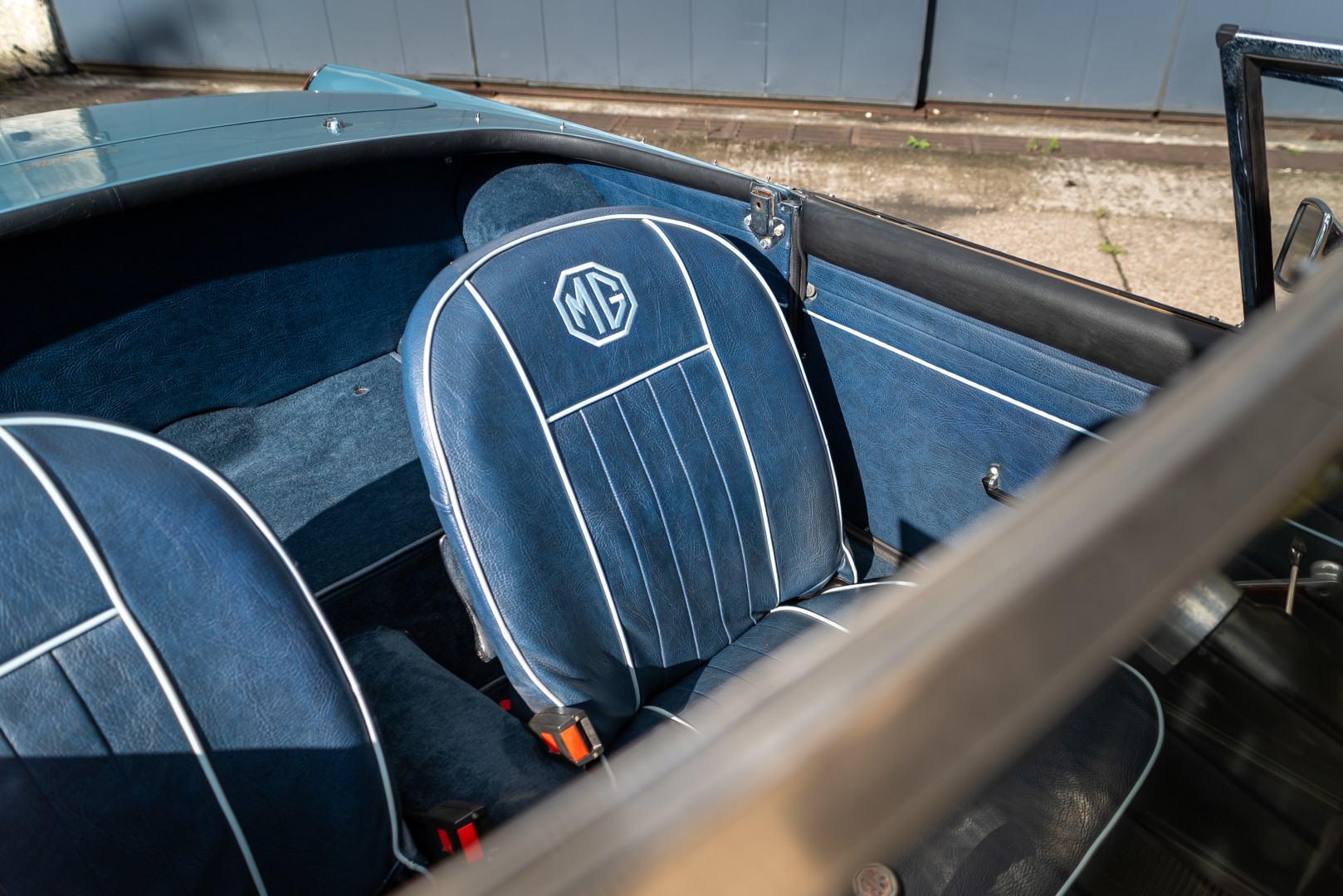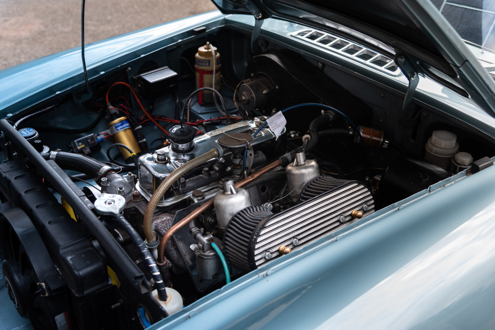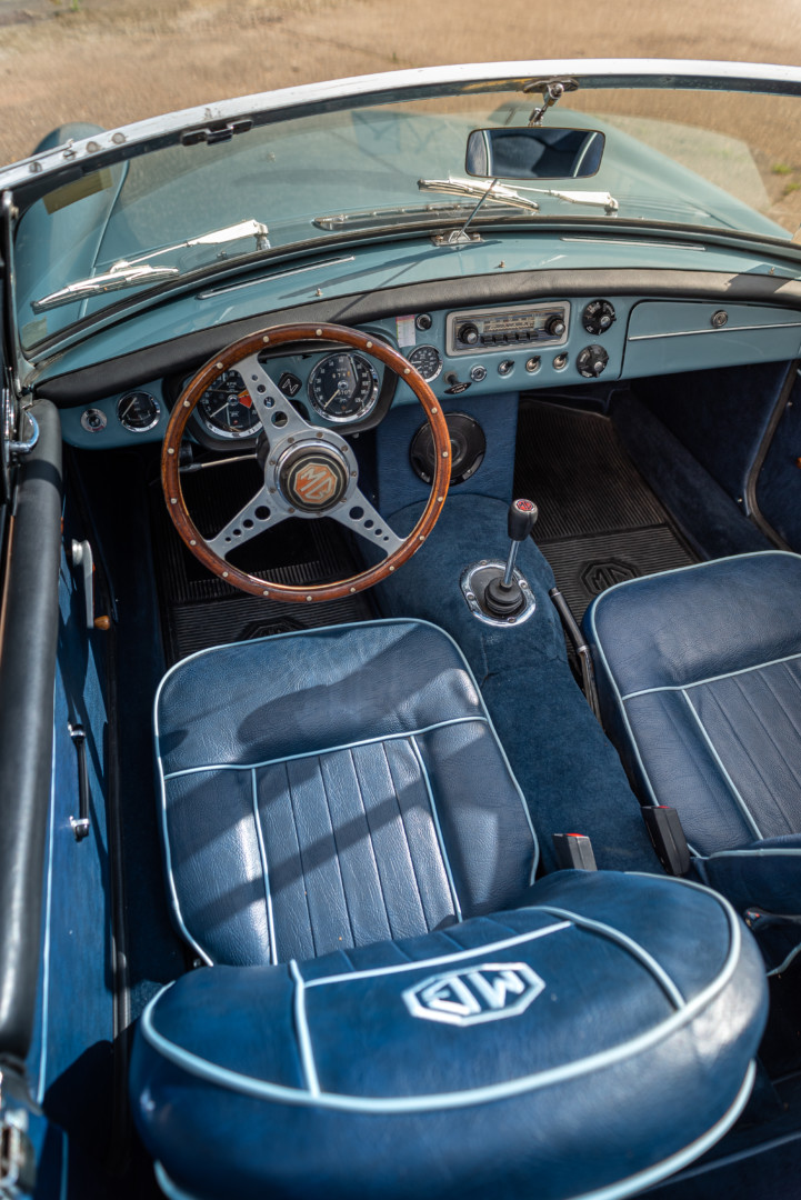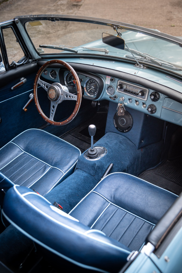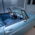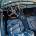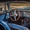 Sa sellerie en bleu marine et passe-poiles bleu ciel, accordés à la carrosserie, est en excellent état et une superbe patine. Les moquettes sont propres ainsi que les panneaux de portes. Elle possède également sa capote et son couvre tonneau, l'ensemble en très bel état.