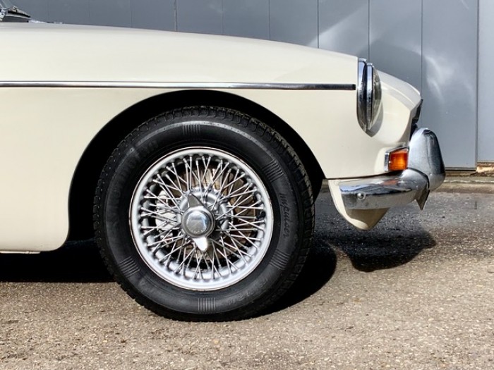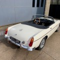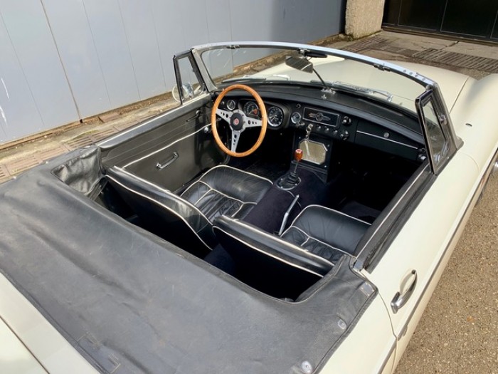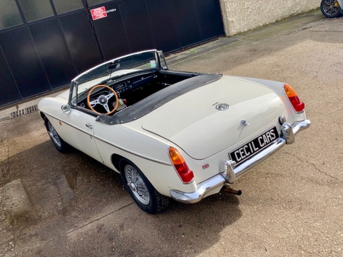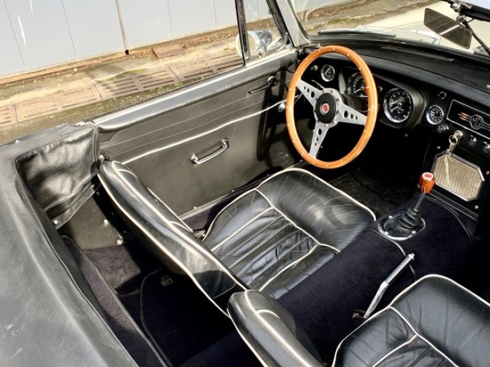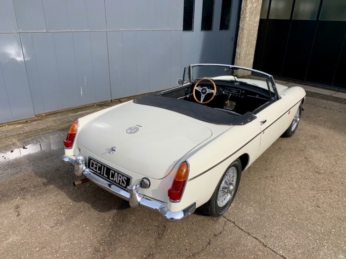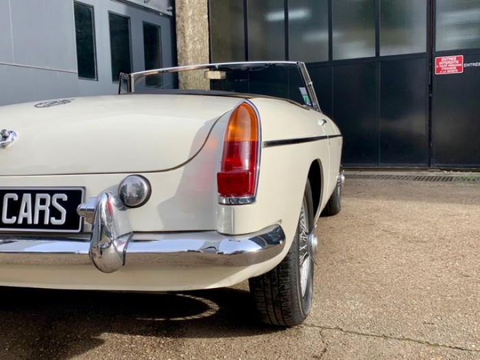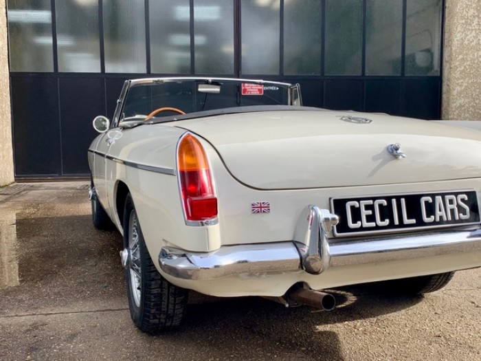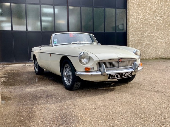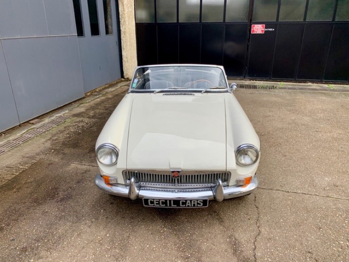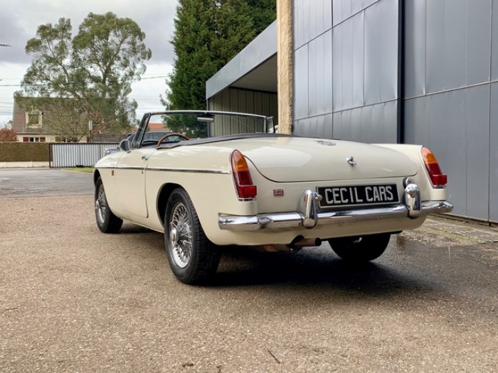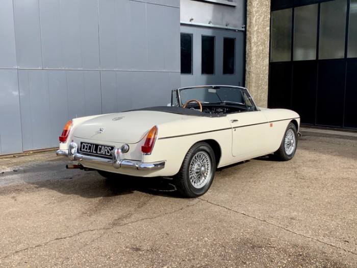 Lancée en 1962, la B est l'héritière des TC et TF d'après-guerre mais surtout de la MG A, elle sera la première à vraiment prendre en considération les attentes du marché américain, qui s'est pris de passion pour les MGA. Plus confortable, moins dépouillé avec vitres latérales et capote, plus performante et plus habitable. Ainsi, elle reçoit une caisse monocoque plus rigide et se voit équipé d'un 4 cylindres 1.8L. Ce bloc, dérivé du moteur 1 622 cm3 de la MG A, développe 95 ch et propulse la B à près de 170 km/h.