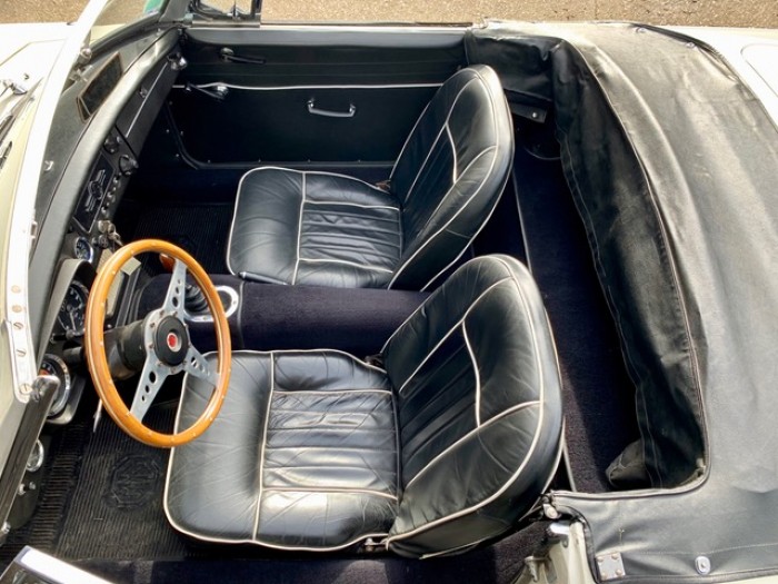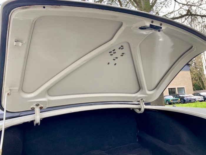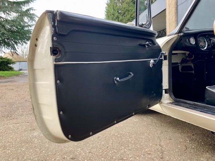 Sa sellerie en cuir noir est en excellent état d'origine avec un liseré blanc et une superbe patine. Les moquettes sont propres ainsi que les panneaux de portes.