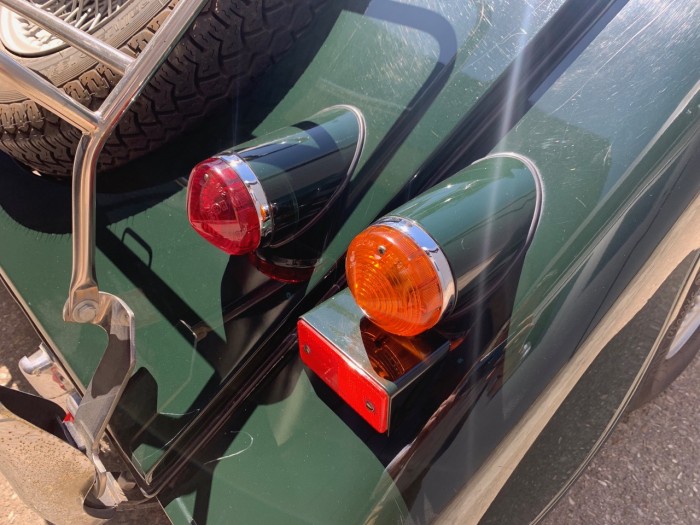 Arceau de sécurité FIA, échappements latéraux gauche en inox, porte bagages chromé, phares longue-portée, pare-brise rabattage avec saut de vent Brookland.