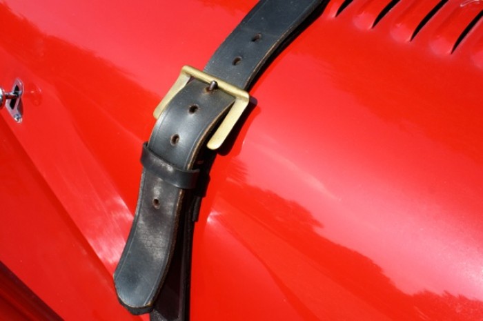 Tonneau cover, jantes à rayons, couvre roue de secours, boite à gants fermée, sangle en cuir sur le capot.