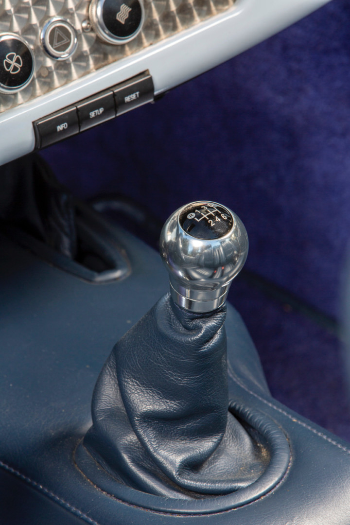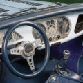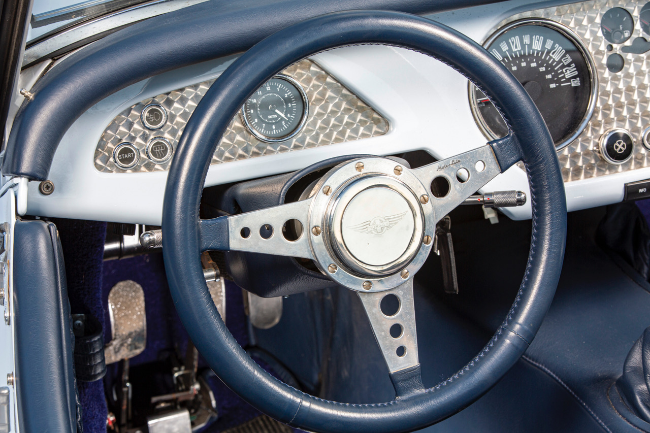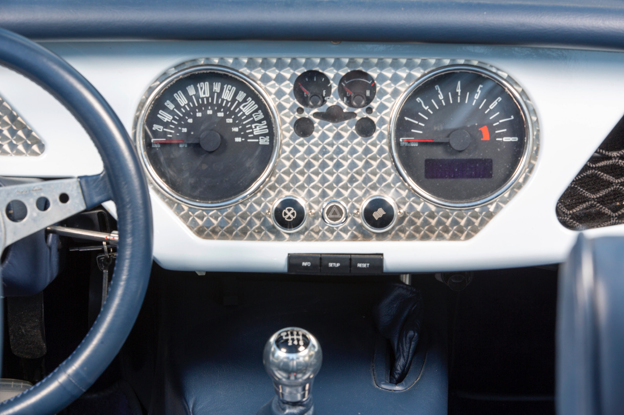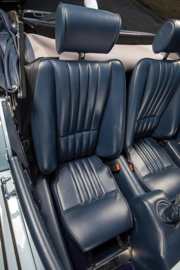 Sa sellerie en cuir bleu est en excellant état avec une belle patine. Les moquettes sont propres ainsi que les panneaux de portes. Elle est équipée d'une capote, des sides-screen et d'un tonneau cover bleu assorties à la voiture.