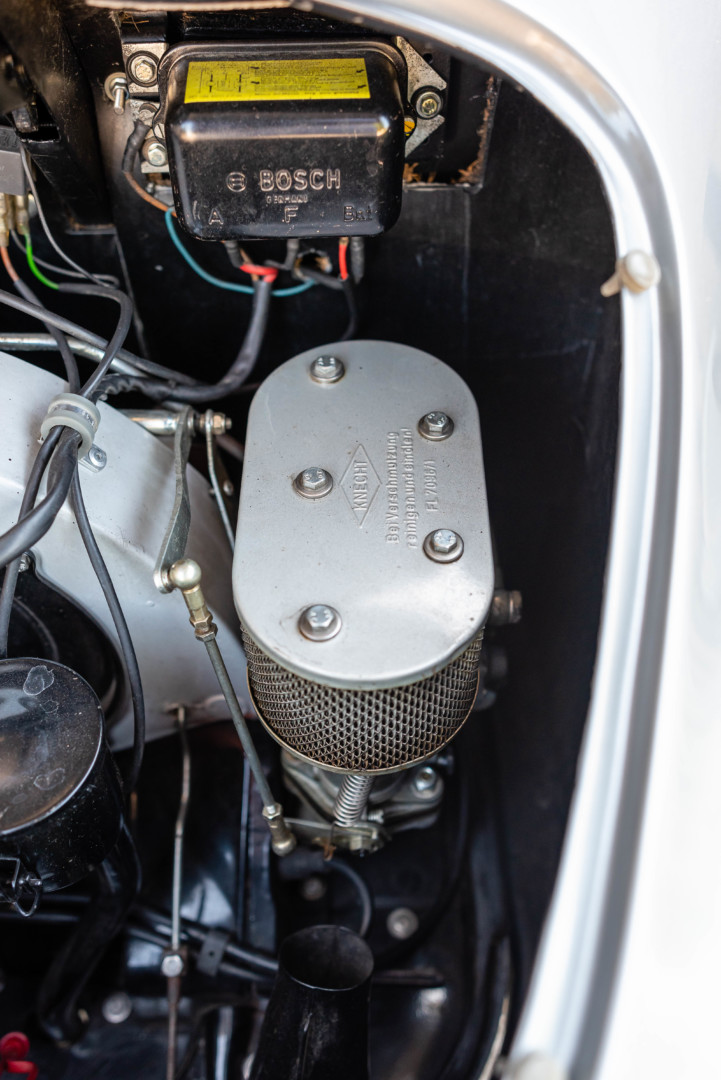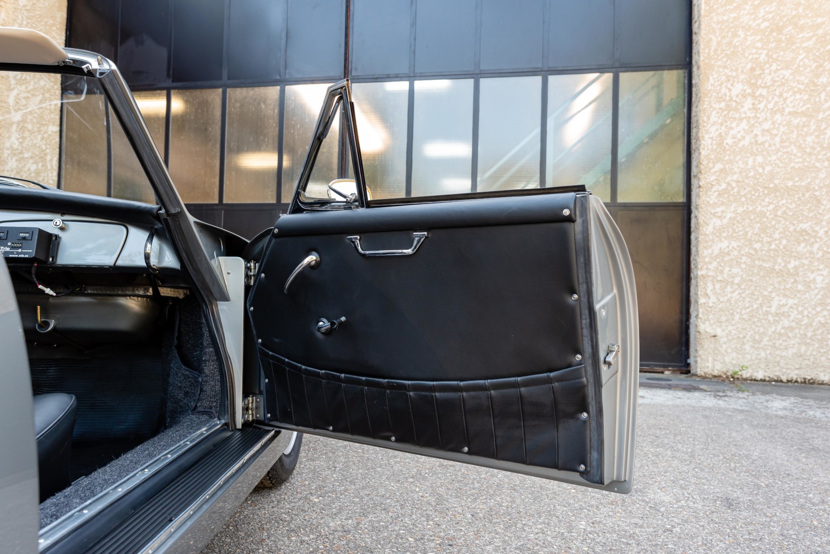 L’intérieur, entièrement restauré en cuir noir, est resté en excellent état et a été soigneusement entretenu depuis. La capote, restaurée dans nos ateliers, est superbe, tout comme les moquettes et son tapis en caoutchouc, qui conservent une présentation impeccable.