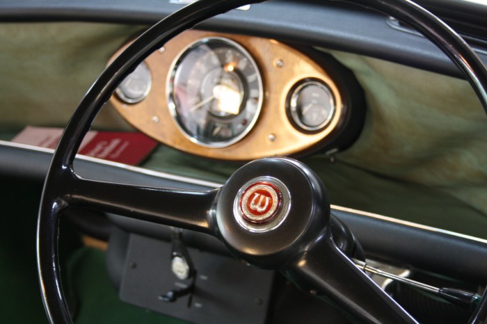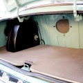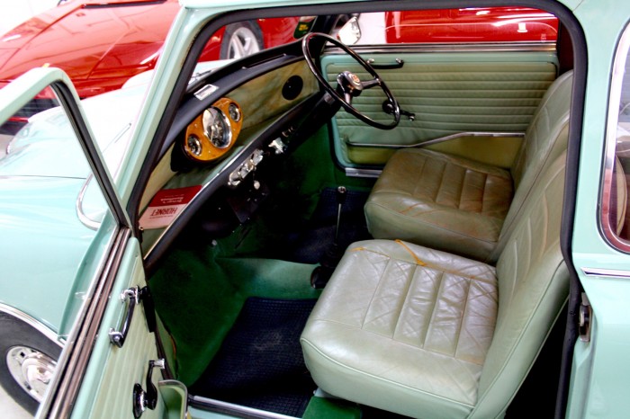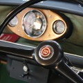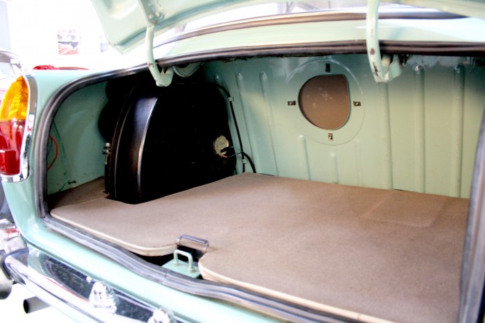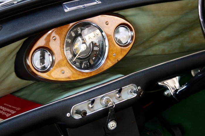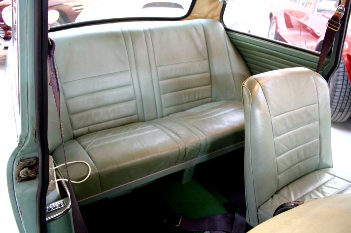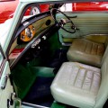 Elle possède une excellente carrosserie et ses cuirs vert d'origine sont en très bon état avec une belle patine d'origine, seul l'assise du siège passager à subit les outrages du temps. Le pavillon et les moquettes sont propres ainsi que les panneaux de portes.